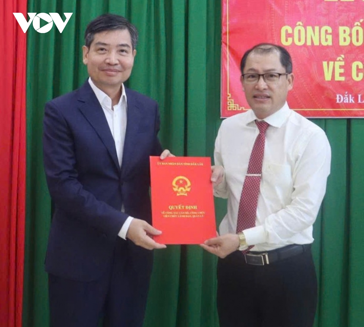 Ông Tạ Anh Tuấn, Chủ tịch UBND tỉnh Đắk Lắk trao quyết định bổ nhiệm Giám đốc Ban A cho ông Trần Tiến Đông (bên phải)