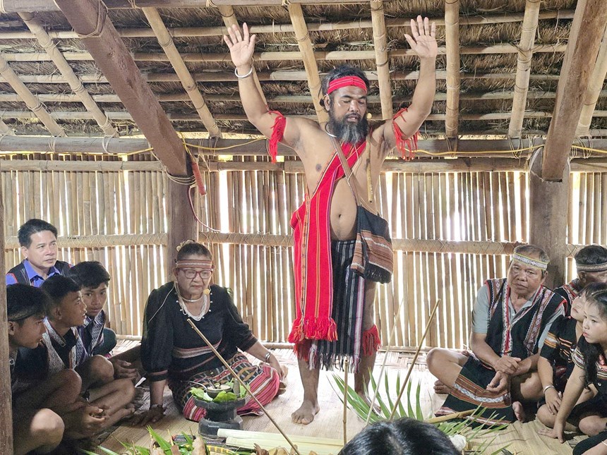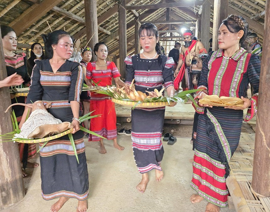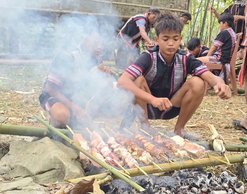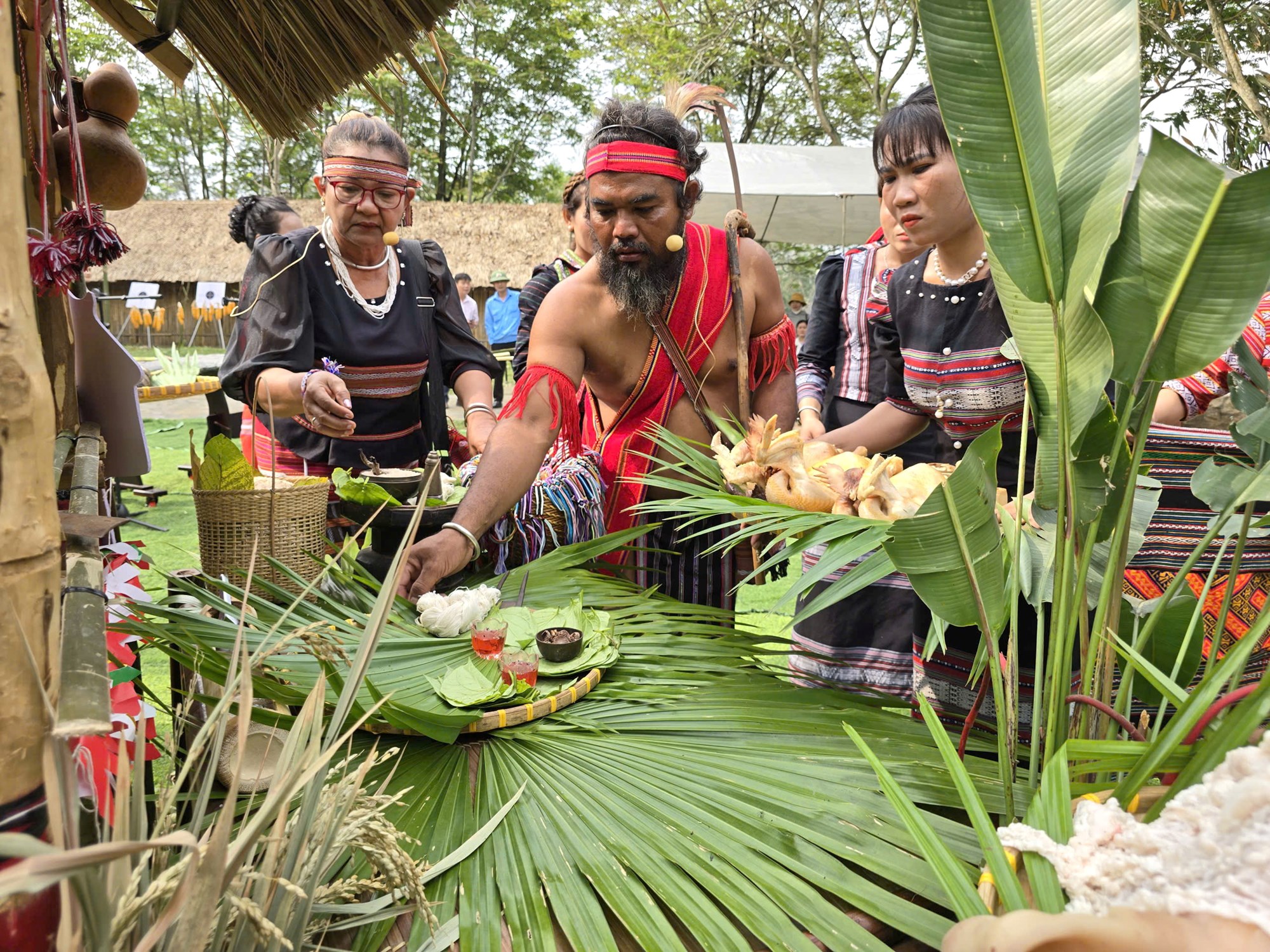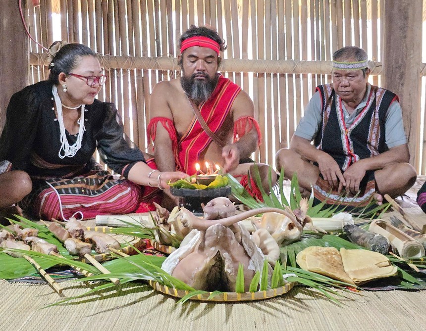 Trong không khí rộn ràng của tiếng cồng chiêng ngân vang giữa đại ngàn, Già làng và Chủ tế thay mặt cộng đồng dâng lễ, đọc những lời khấn mộc mạc nhưng đầy niềm tin vào sự che chở của thần linh, cầu mong cuộc sống ấm no, con người khỏe mạnh.