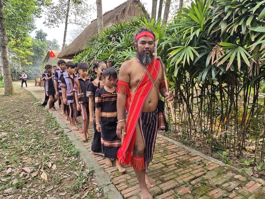 Đoàn rước gồm đội cồng chiêng vừa đi vừa diễn tấu hòa cùng đội dẫn lễ tiến về phía Nhà dài cộng đồng.