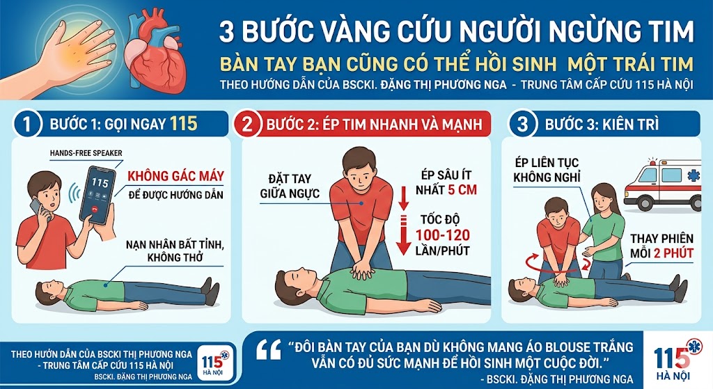 Công thức sinh tồn ba bước: Gọi 115 - Ép tim - Kiên trì.