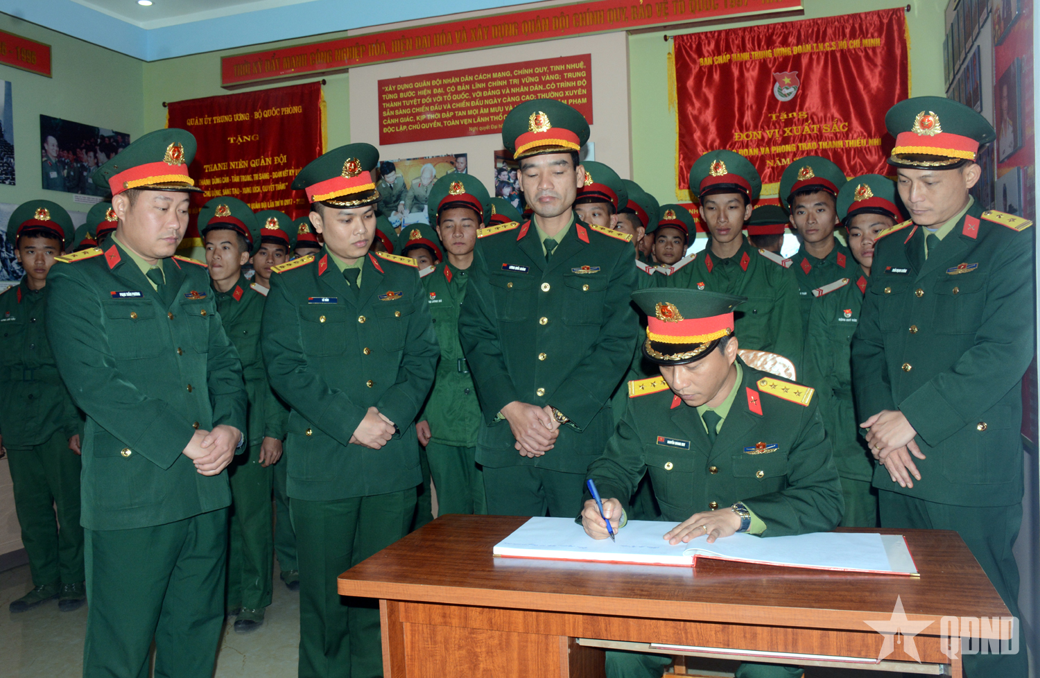 Thượng tá Nguyễn Quang Huy ghi sổ lưu niệm tại Nhà truyền thống Chi đoàn thanh niên cứu quốc đầu tiên trong Quân đội.