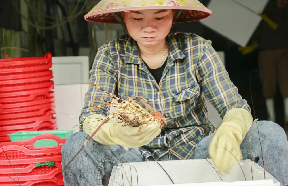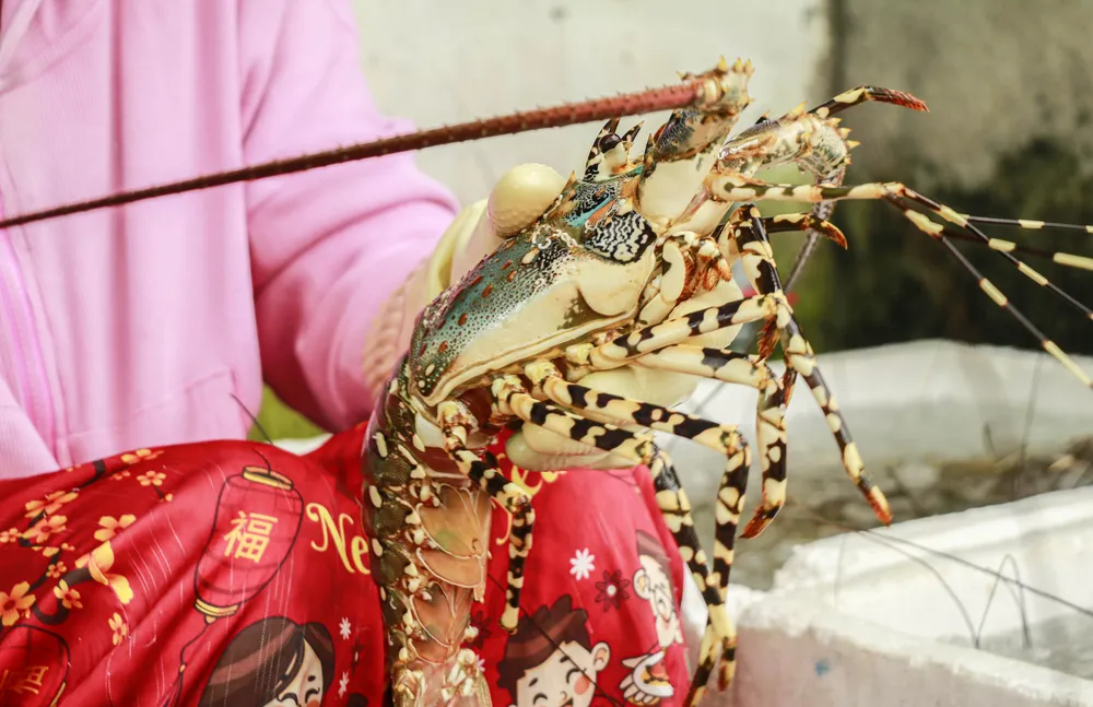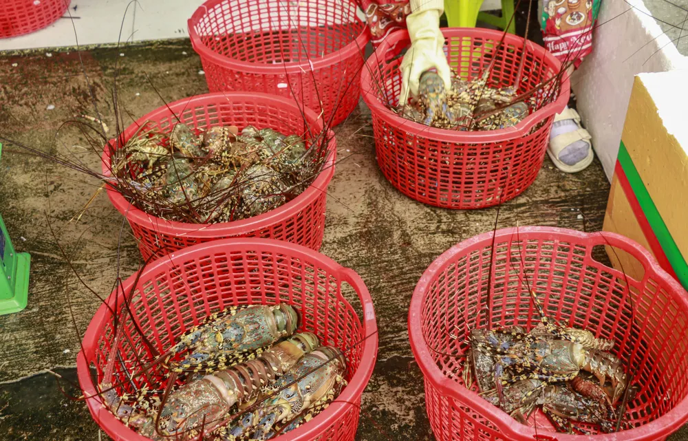 Hiện giá tôm hùm bông dao động 1,5-1,8 triệu đồng/kg, còn tôm xanh chỉ còn 550.000-800.000 đồng/kg tùy loại.