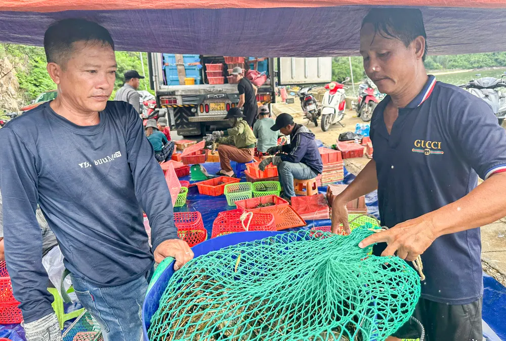 "Dù giá tôm giảm 75.000-100.000 đồng/kg so với ngày thường nhưng phải bán vì nếu bão vào, lồng bè bị đánh hỏng coi như mất trắng" - bà Nguyễn Thị Lành, chủ gần 50 lồng nuôi tôm hùm ở Vũng Rô chia sẻ.