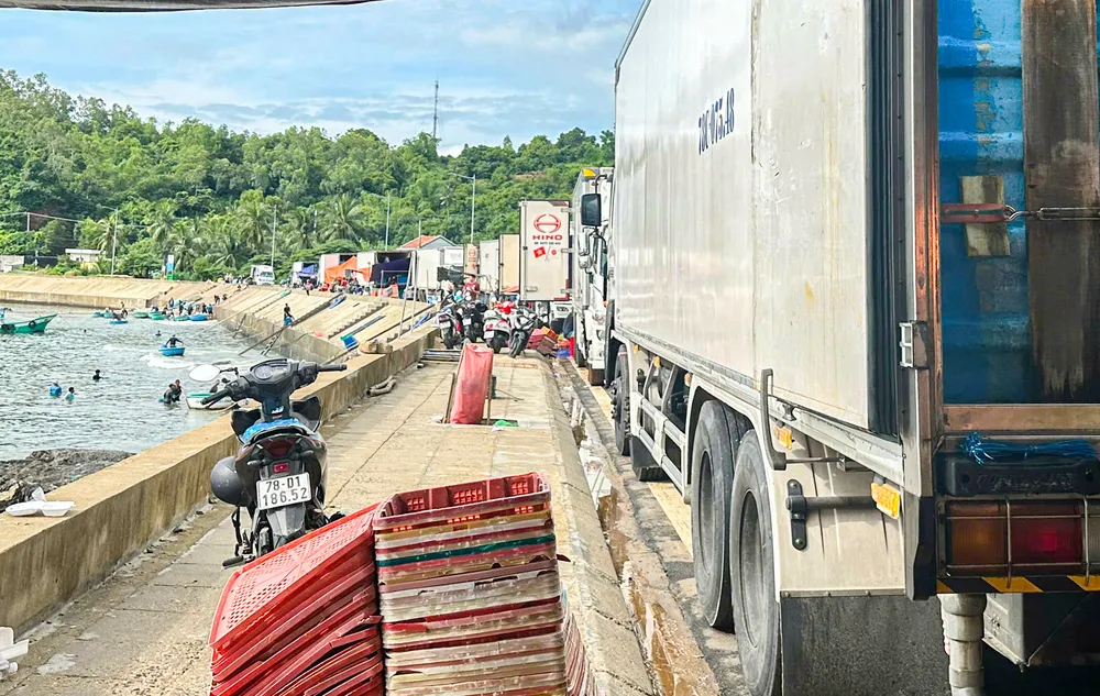 Hàng dài xe đông lạnh mua tôm hùm ở phường Xuân Đài.
