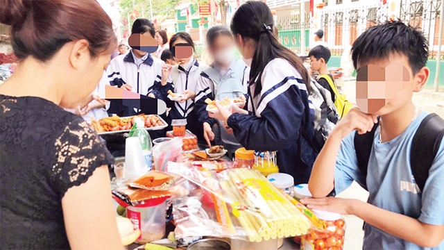 Thực phẩm không an toàn bày bán trước cổng trường. Ảnh: ND