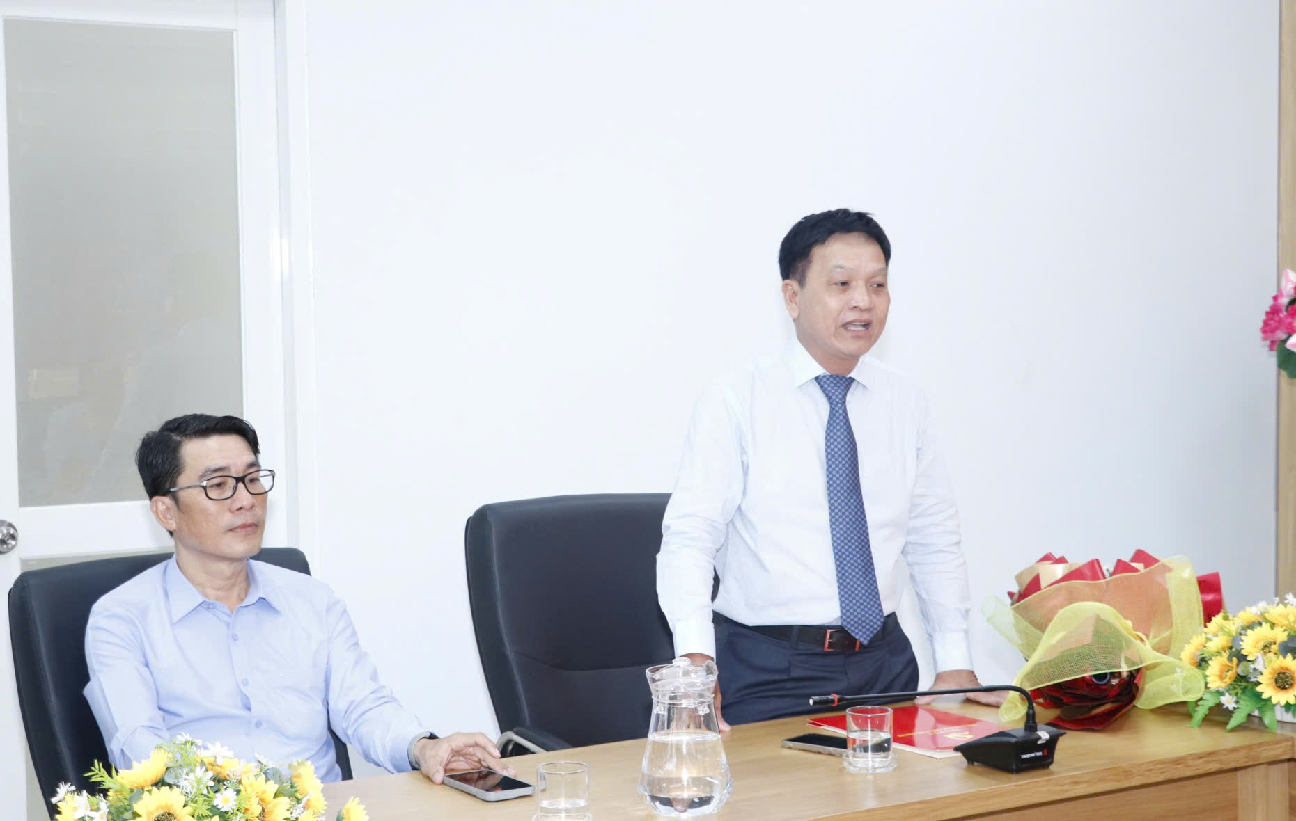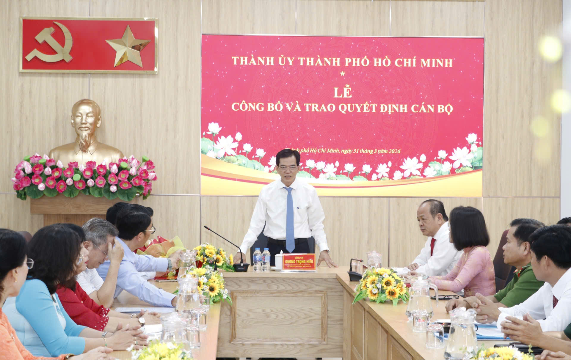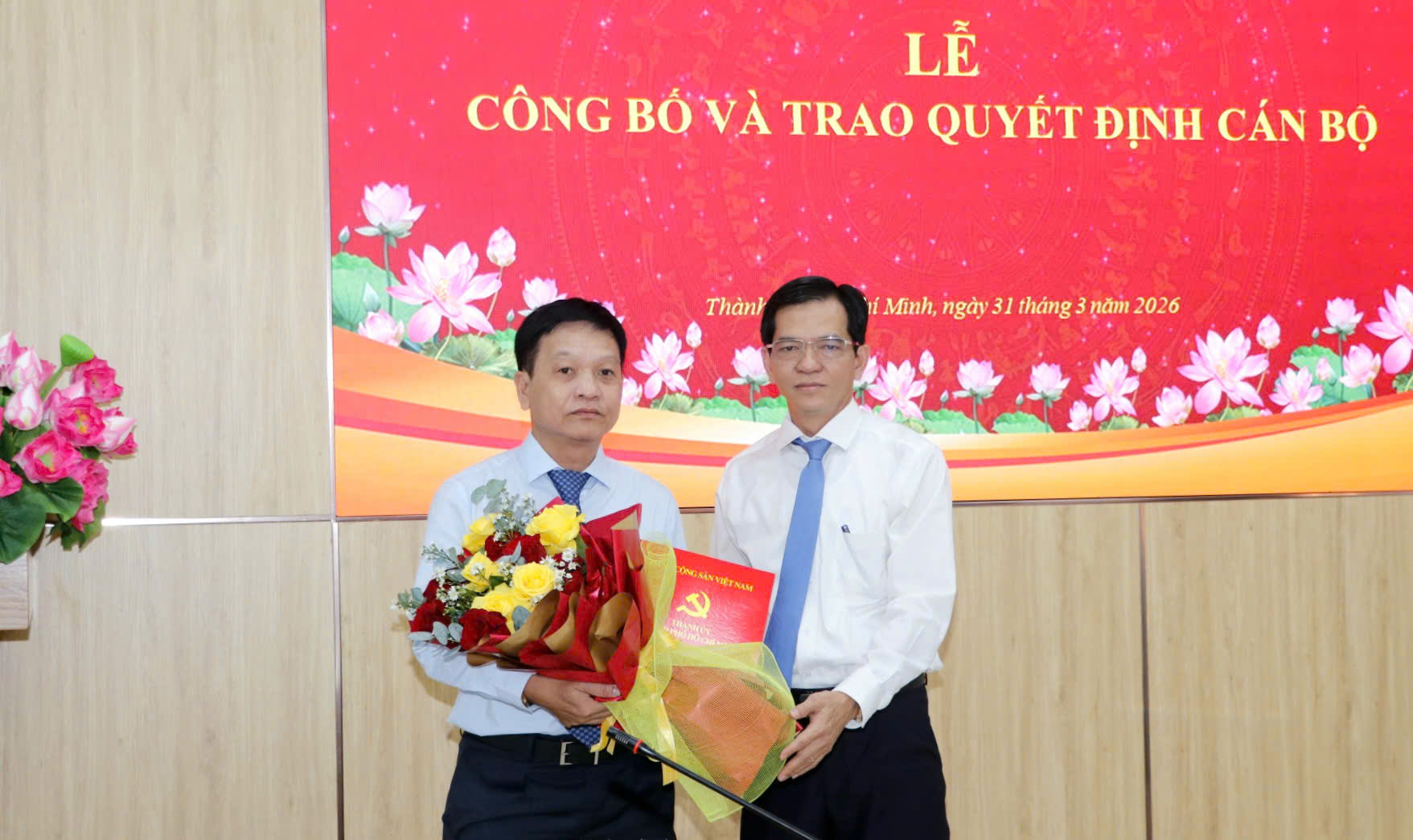 Chủ nhiệm Ủy ban Kiểm tra Thành ủy TPHCM trao quyết định và hoa chúc mừng đồng chí Đỗ Đăng Ái. Ảnh: NGÔ BÌNH