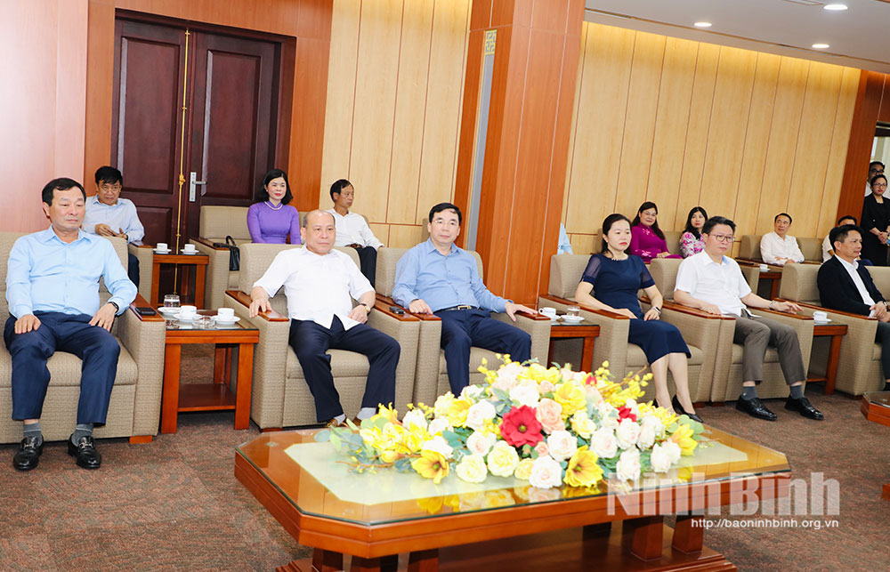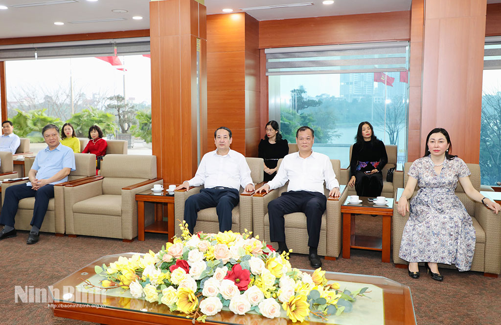 Tiếp và làm việc với Đoàn công tác của Ban Thường vụ Tỉnh ủy Ninh Bình, về phía tỉnh Phú Thọ có các đồng chí: Trần Duy Đông, Ủy viên dự khuyết Trung ương Đảng, Phó Bí thư Tỉnh ủy, Chủ tịch UBND tỉnh; Bùi Văn Quang, Phó Bí thư Thường trực Tỉnh ủy; Bùi Đức Hinh - Phó Bí thư Tỉnh ủy, Chủ tịch HĐND tỉnh; Bùi Thị Minh, Phó Bí thư Tỉnh ủy, Chủ tịch Ủy ban MTTQ Việt Nam tỉnh; Bùi Huy Vĩnh, Phó Bí thư Tỉnh ủy; các đồng chí Ủy viên Ban Thường vụ Tỉnh ủy; lãnh đạo một số sở, ban ngành trong tỉnh.