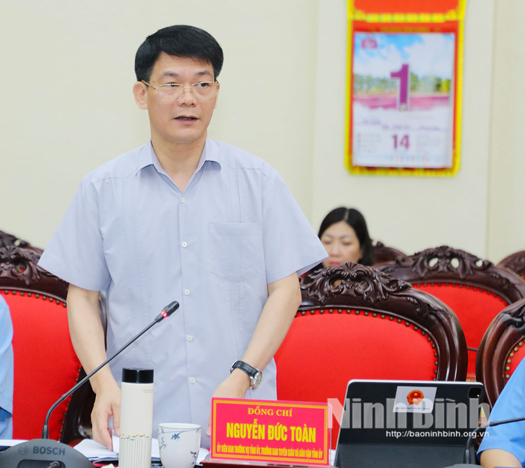 Đồng chí Nguyễn Đức Toàn, Ủy viên Ban Thường vụ Tỉnh ủy, Trưởng Ban Tuyên giáo và Dân vận Tỉnh ủy phát biểu tại hội nghị.