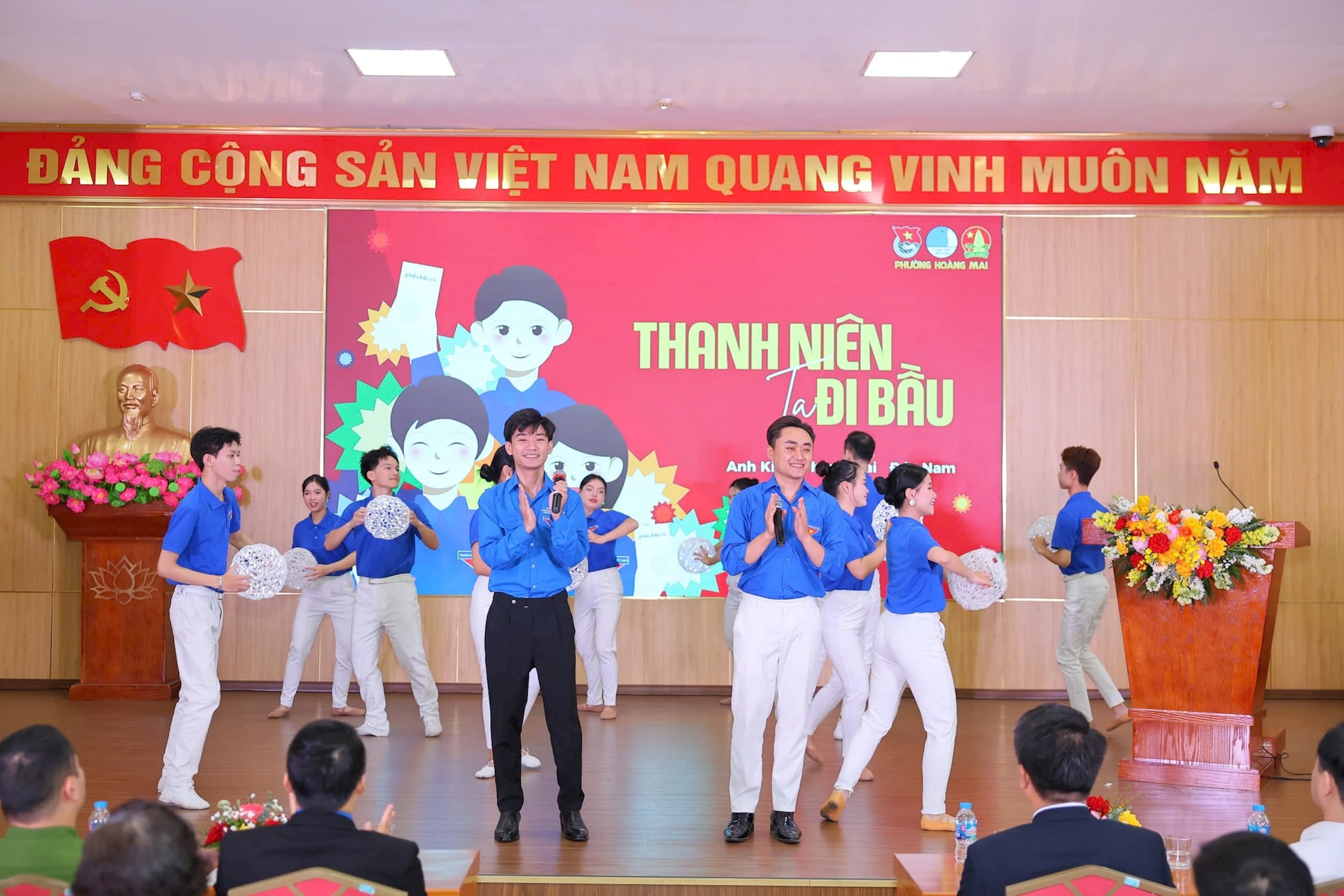 Thanh niên phường Hoàng Mai thể hiện ca khúc “Thanh niên ta đi bầu”. Ảnh: MT