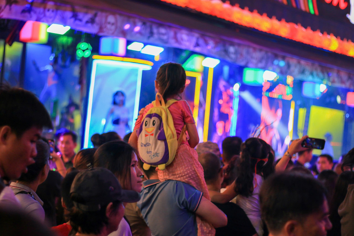 Nhiều phụ huynh cõng con trên vai giữa dòng người đông đúc ở phố Bùi Viện.