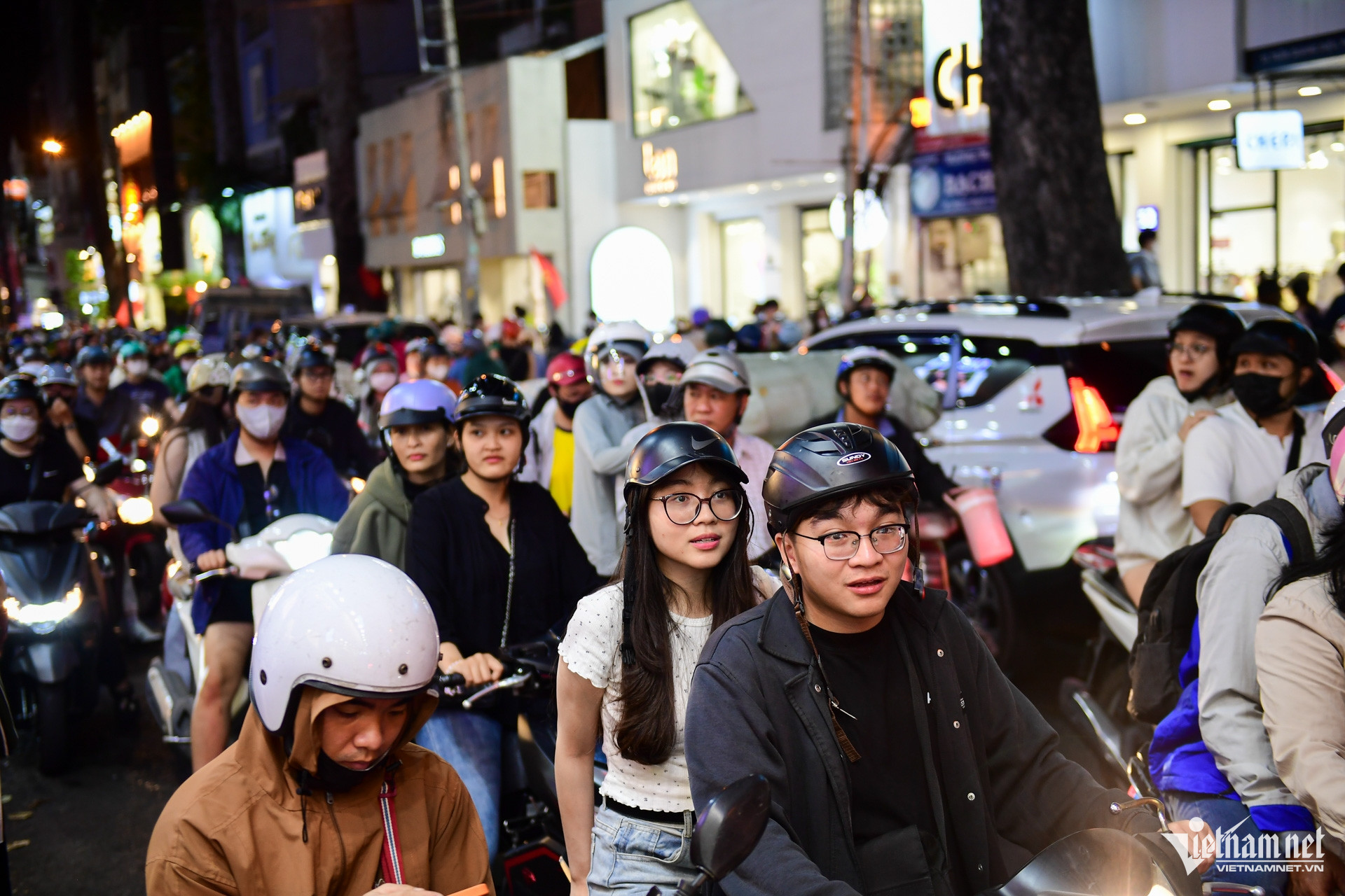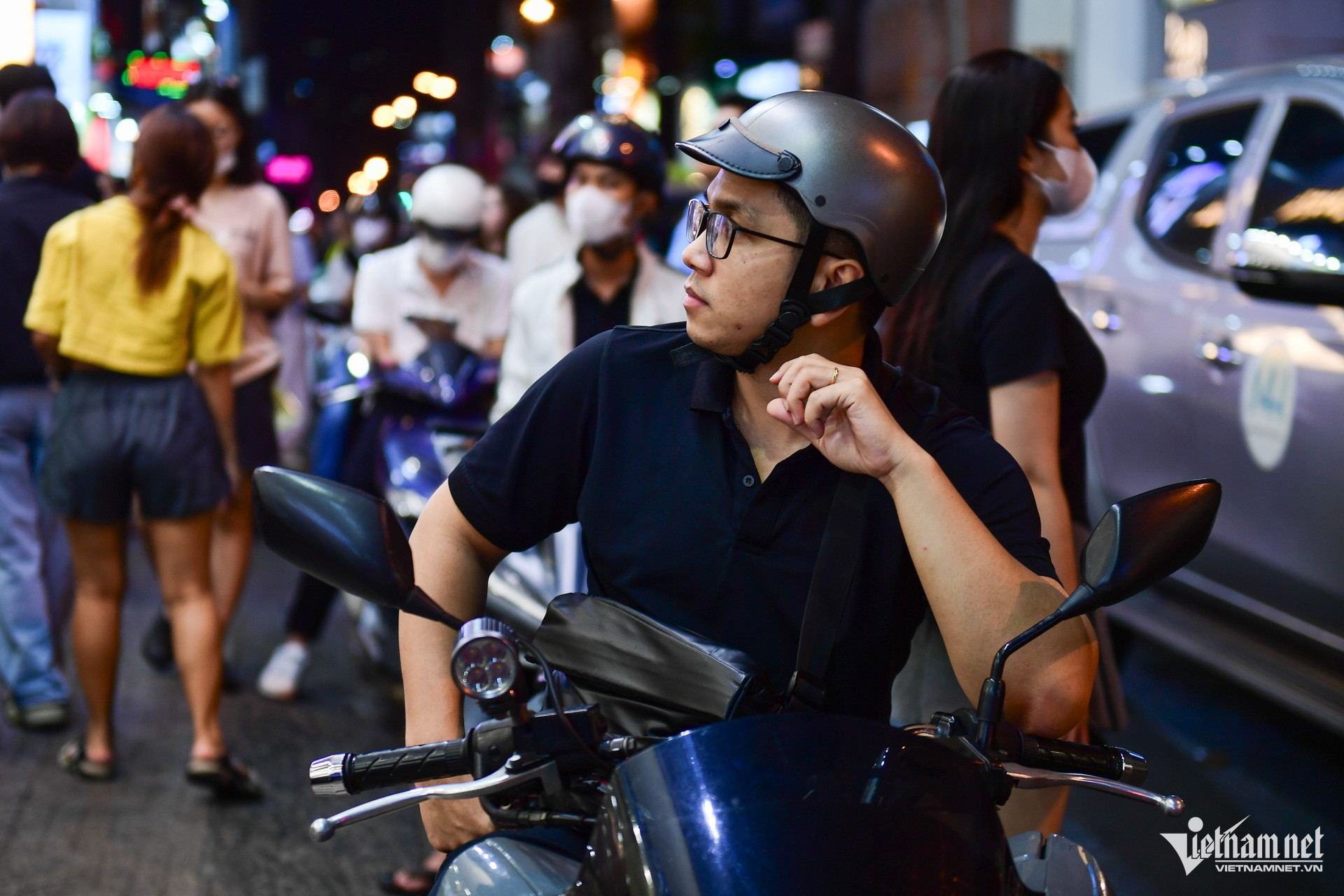 Do di chuyển khó khăn, nhiều thanh niên đưa bạn gái hoặc người thân đi mua sắm dựng xe bên lề đường ngồi chờ. “Cửa hàng quá đông, tôi đứng ngoài đợi cũng khó tìm chỗ gửi xe”, một thanh niên nói.