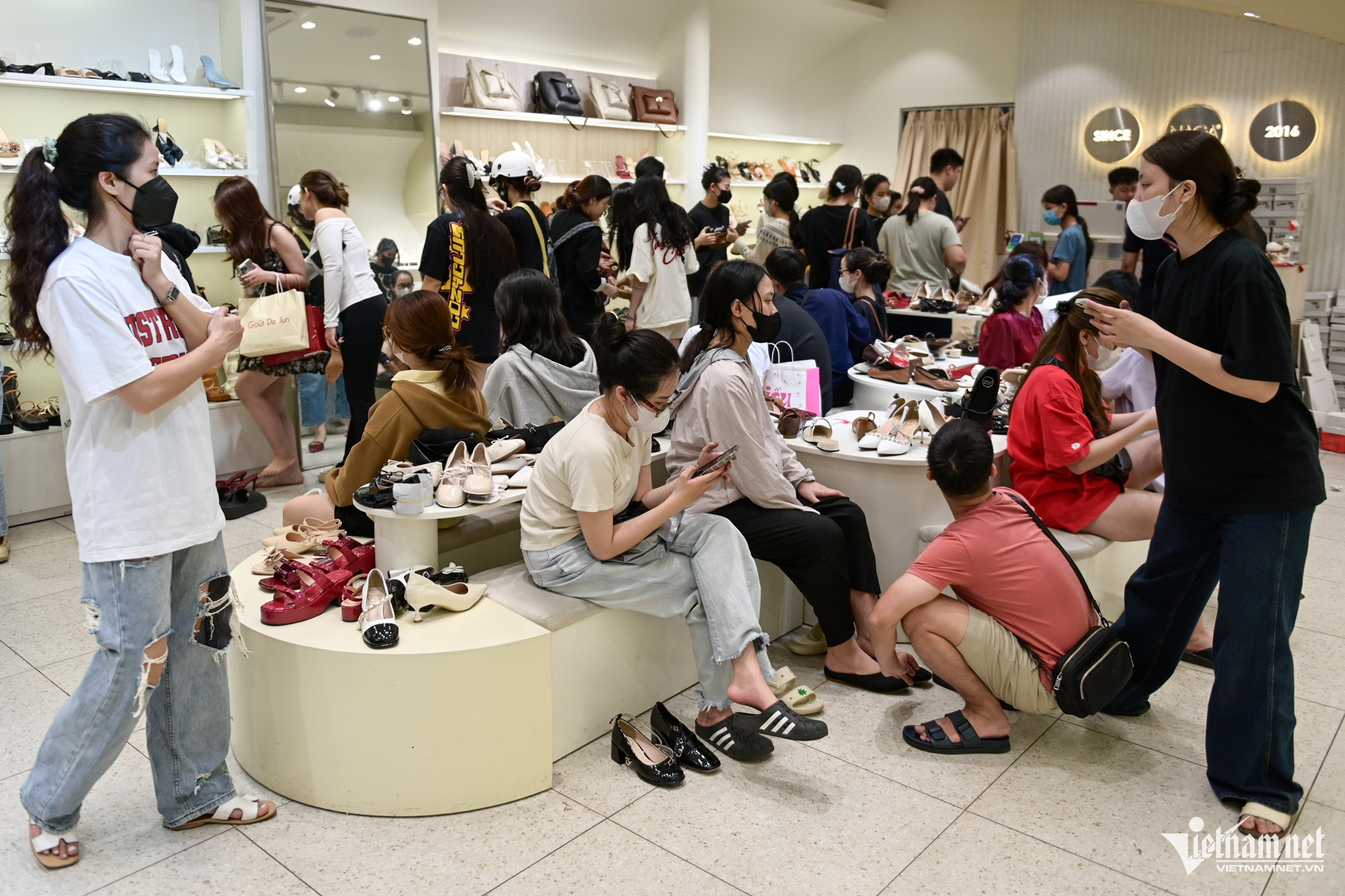 Một tiệm giày trong tình trạng quá tải khách, lối đi chật kín người thử giày, chọn mẫu. Nhân viên liên tục mang size, đổi kiểu theo yêu cầu.