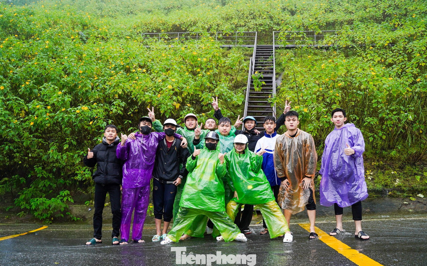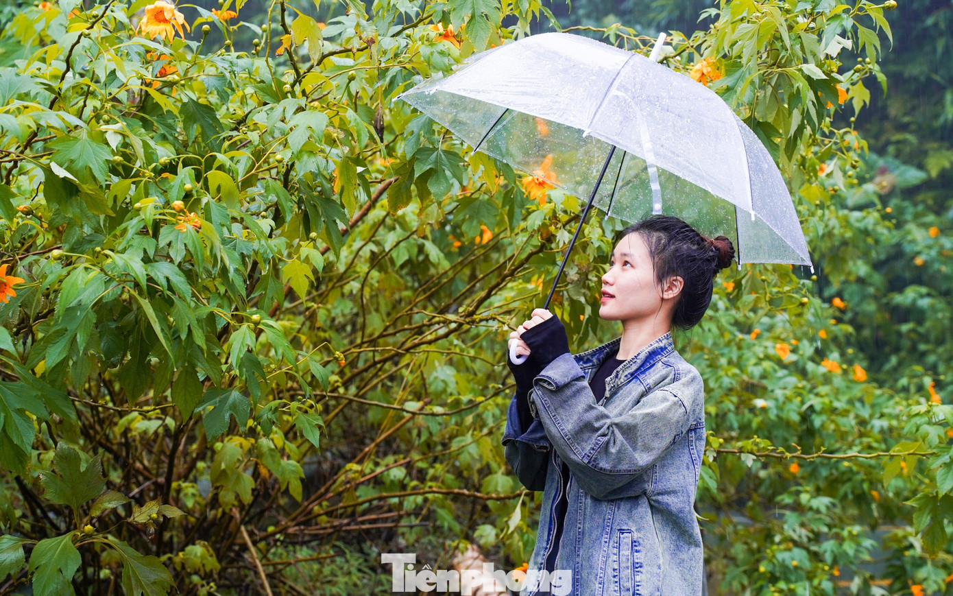 Dù mưa, các bạn trẻ vẫn hăng say chụp hình với hoa dã quỳ. '"Thời tiết này khiến bọn mình khá tiếc khi không thể có những tấm ảnh đẹp", bạn Linh (Long Biên, Hà Nội) chia sẻ.