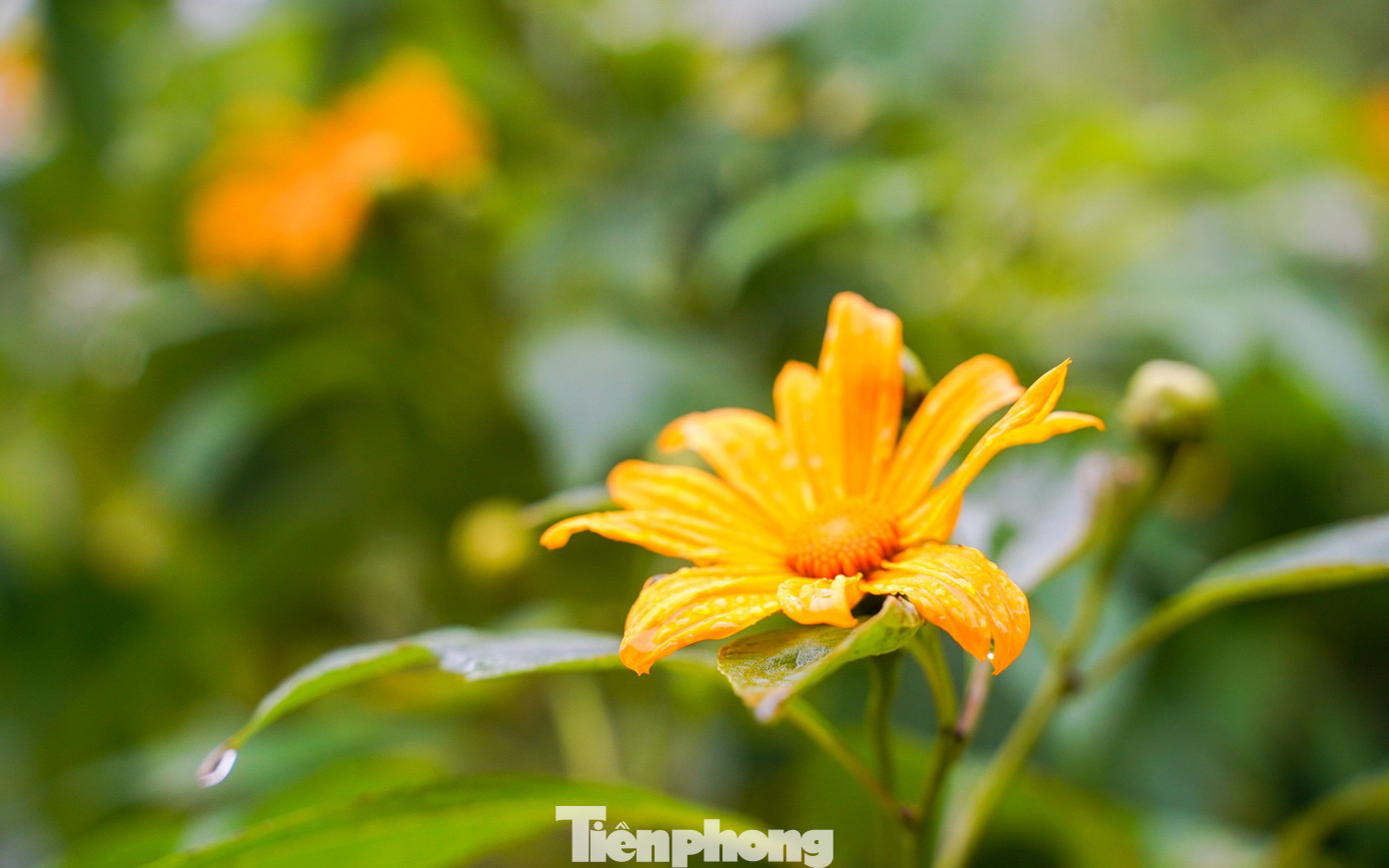 Trong cơn mưa, sắc vàng hoa dã quỳ vẫn rực rỡ.