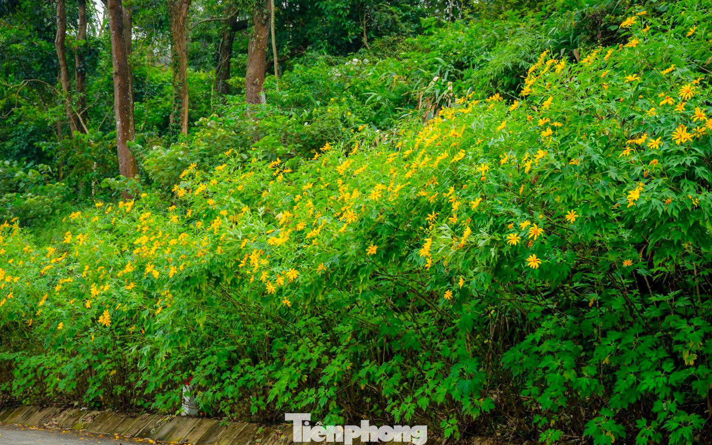 Trên cung đường của Vườn Quốc gia Ba Vì, từng vạt hoa dã quỳ đang độ bung nở, trải dài vàng rực rỡ.