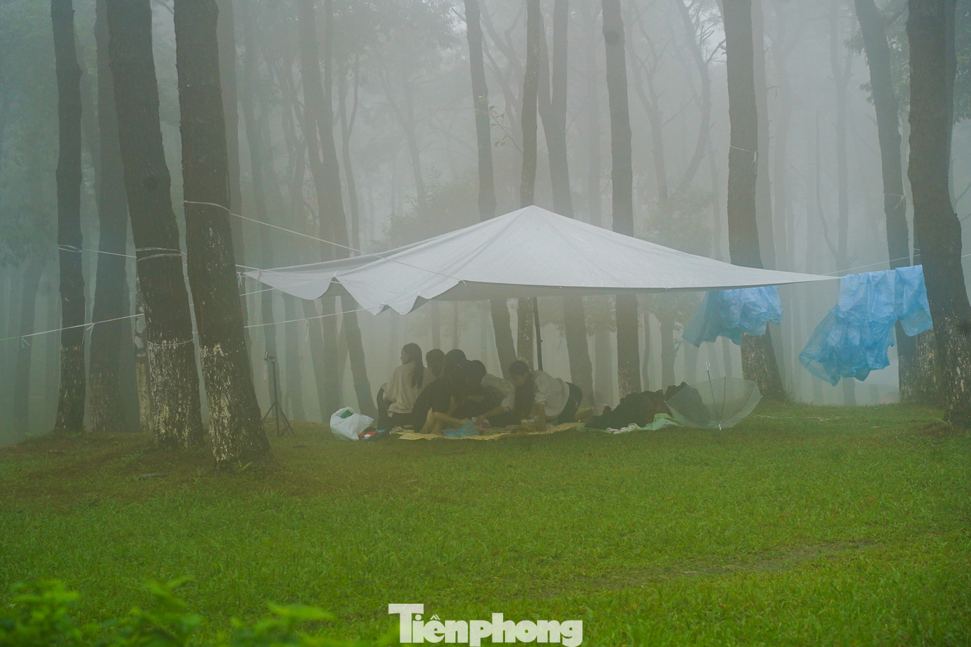 Trời mưa dày đặc, một số nhóm bạn trẻ quyết định thuê lều cắm trại để nghỉ ngơi và ăn uống. "Mình mong chiều tạnh mưa để có thể chụp ảnh với hoa dã quỳ", anh Trần Hiếu (Vĩnh Phúc) chia sẻ.
