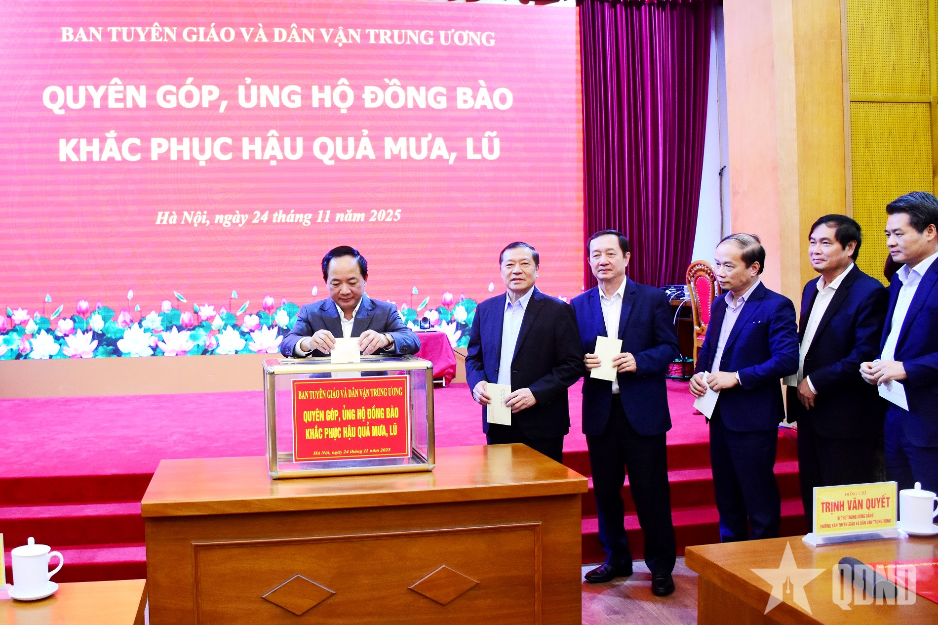 Đồng chí Trịnh Văn Quyết, Bí thư Trung ương Đảng, Trưởng ban Tuyên giáo và Dân vận Trung ương, các đồng chí lãnh đạo Ban Tuyên giáo và Dân vận Trung ương tham gia quyên góp ủng hộ đồng bào khắc phục hậu quả do mưa, lũ.