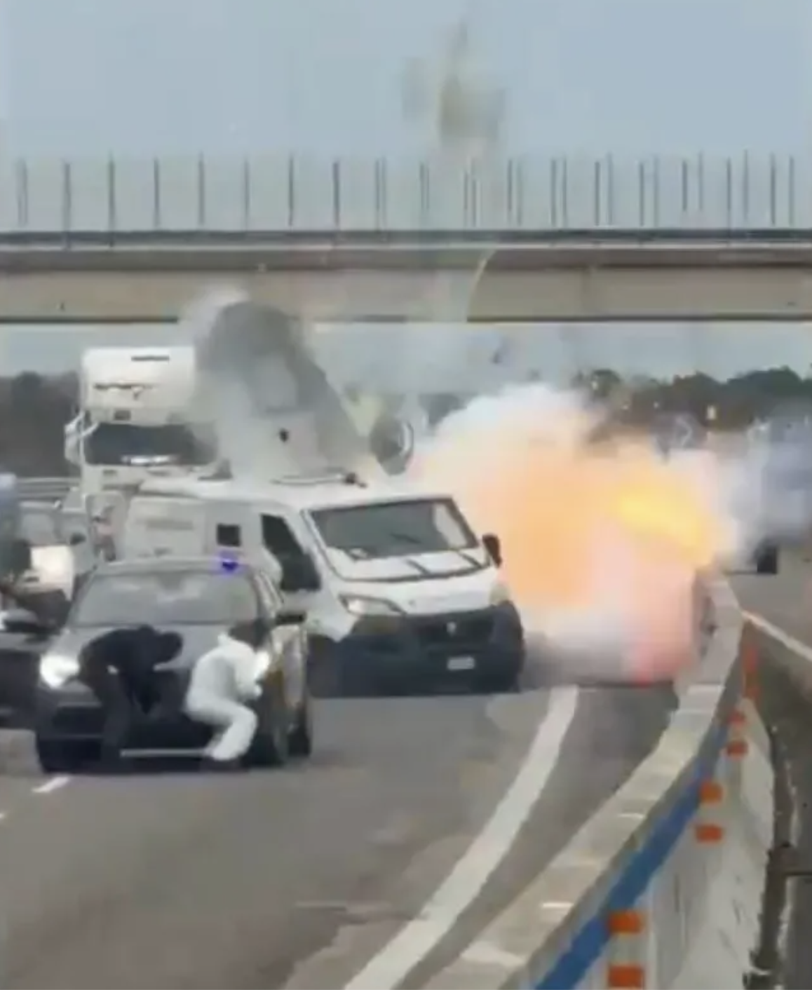 Video từ hiện trường cho thấy các đối tượng mang vũ khí đấu súng trực tiếp với lực lượng hiến binh Carabinieri giữa tuyến đường đông xe qua lại. Tiếng súng vang lên giữa sự hoảng loạn của các tài xế đang lưu thông. Nhóm đối tượng đã bắn một viên đạn trúng kính chắn gió của xe cảnh sát.