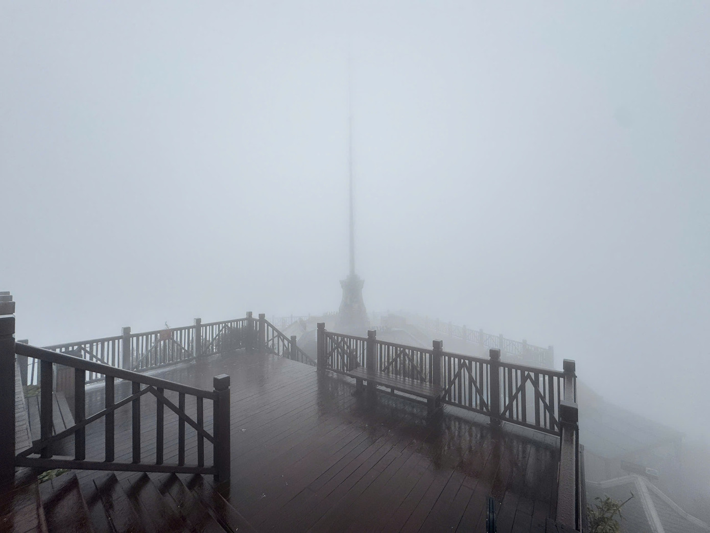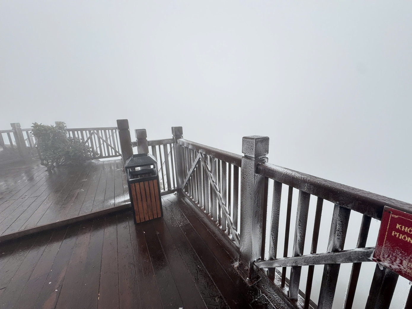 Sáng 7/1, băng giá bám trắng các triền núi, lan can, bậc đá và mái công trình trên đỉnh Fansipan.