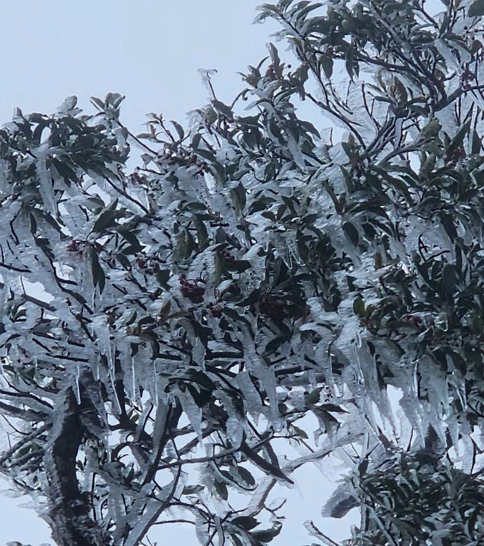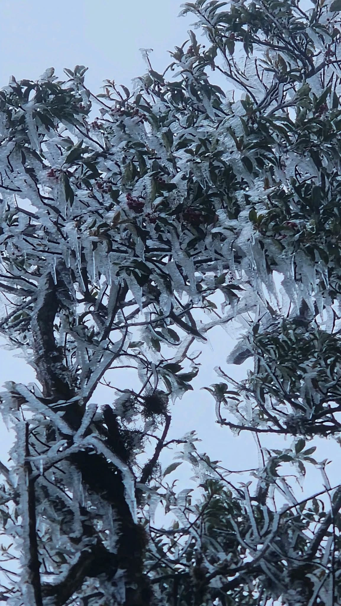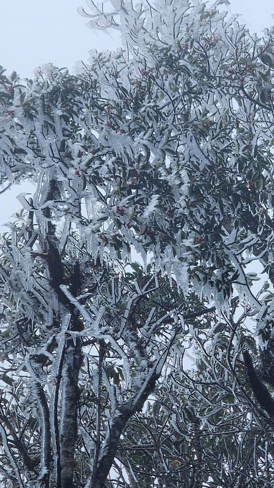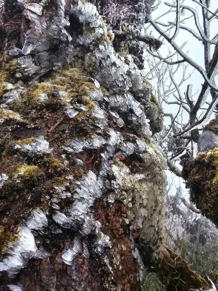 Hiện tại, thời tiết ở Tà Xùa dao động 7–9°C, trong khi nhiệt độ trên núi thấp hơn 2–4°C. Trời nhiều sương mù, đường đèo trơn trượt, lớp băng trên cành cây dày 3–5 cm, có nơi gần 10 cm, chắc chắn và chưa có dấu hiệu tan. Băng có khả năng tiếp tục xuất hiện nếu nhiệt độ giảm vào ngày 20/11. Ảnh Huyen Anh