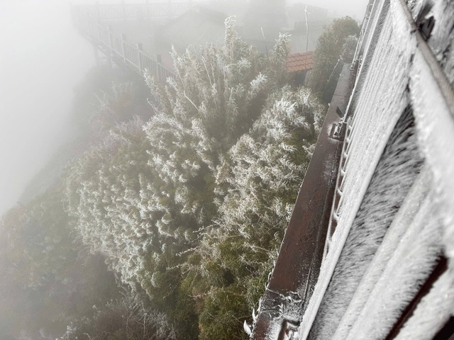 Lớp băng trắng bao phủ lối đi dành cho du khách, các bậc đá, mái đá, khu vực cột cờ cũng như nhiều hạng mục công trình khác. Thảm thực vật trên đỉnh Fansipan cũng bị băng bám dày, tạo nên khung cảnh trắng xóa đặc trưng của mùa đông vùng núi cao.