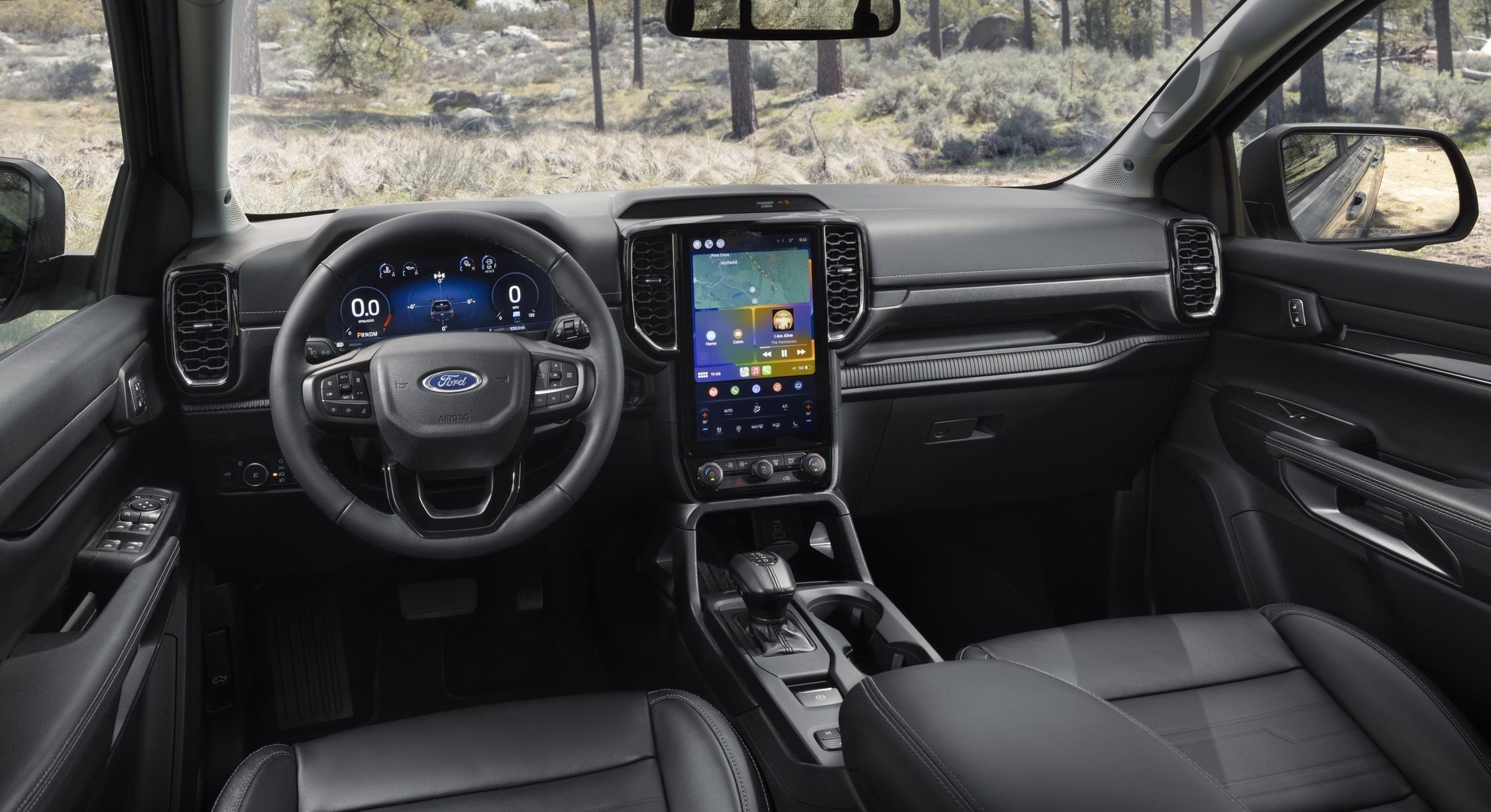 Bước vào bên trong xe, người lái sẽ được chào đón bằng màn hình cảm ứng 12 inch nằm dọc, phục vụ hệ thống thông tin giải trí Ford SYNC 4, bảng đồng hồ kỹ thuật số, camera 360 độ với độ phân giải cao và sạc điện thoại thông minh không dây.