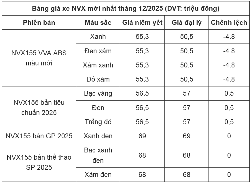 Giá niêm yết của xe Yamaha NVX trong tháng 12 này vẫn giữ nguyên mức cũ của tháng 11-2025, cụ thể: NVX 155 VVA ABS màu mới đang được bán ở mức giá 55,3 triệu đồng, NVX 155 tiêu chuẩn đang được bán ở mức giá 56,5 triệu đồng, NVX 155 GP đang được bán ở mức giá 69 triệu đồng và NVX 155 thể thao SP đang được bán ở mức giá 68 triệu đồng.