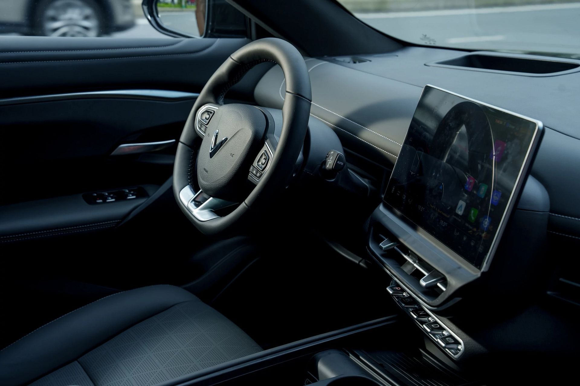 Phía dưới là các nút bấm chức năng. Vô-lăng VF 7 cũng là dạng D-cut thể thao nhưng bắt mắt hơn với phối màu độc đáo. Xe không có đồng hồ hiển thị thông tin lái.