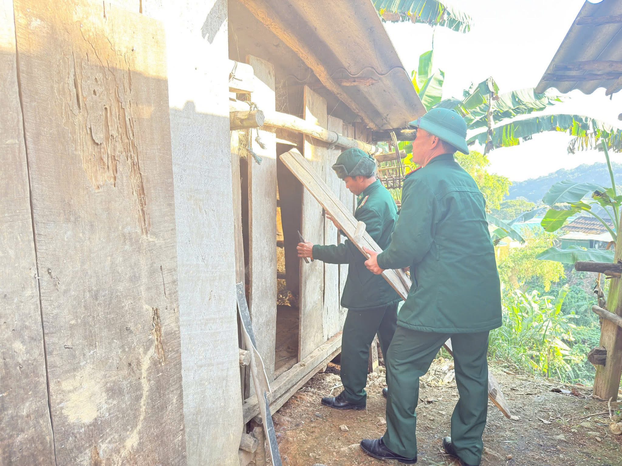 Cán bộ, chiến sĩ Đồn Biên phòng Na Ngoi hỗ trợ bà con che chắn chuồng trại