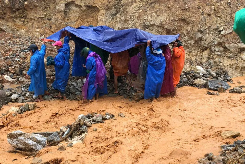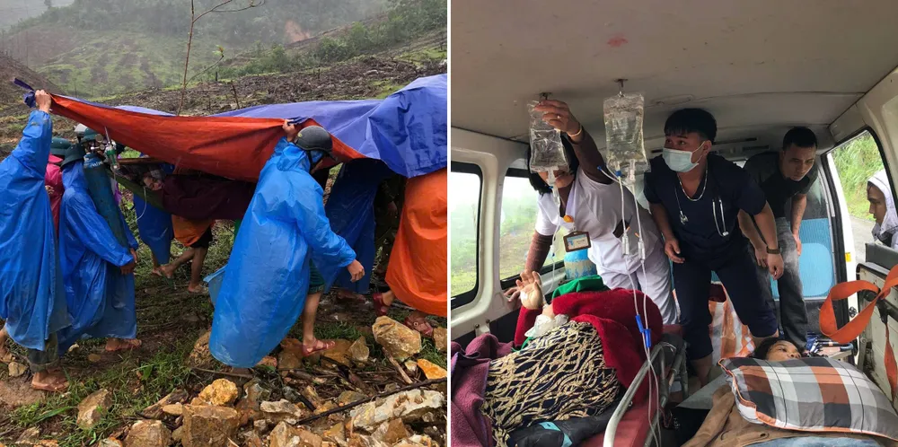 Tại điểm sạt lở, xe cứu thương chỉ tiếp cận được một phía. Lực lượng dân quân thường trực xã Trà Leng cùng người nhà phải dùng võng đưa người bệnh vượt qua đoạn đất đá sạt trượt nguy hiểm để sang phía bên kia, nơi xe cứu thương đang chờ tiếp nhận.