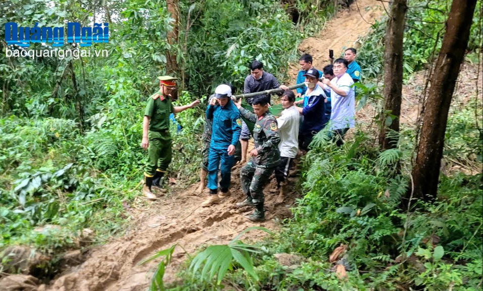 Lực lượng chức năng phối hợp với các y, bác sĩ Trung tâm Y tế Sơn Tây khiêng sản phụ D theo đường rừng, vượt qua cung đường bị sạt lở. Ảnh: PHAN MINH ĐAN
