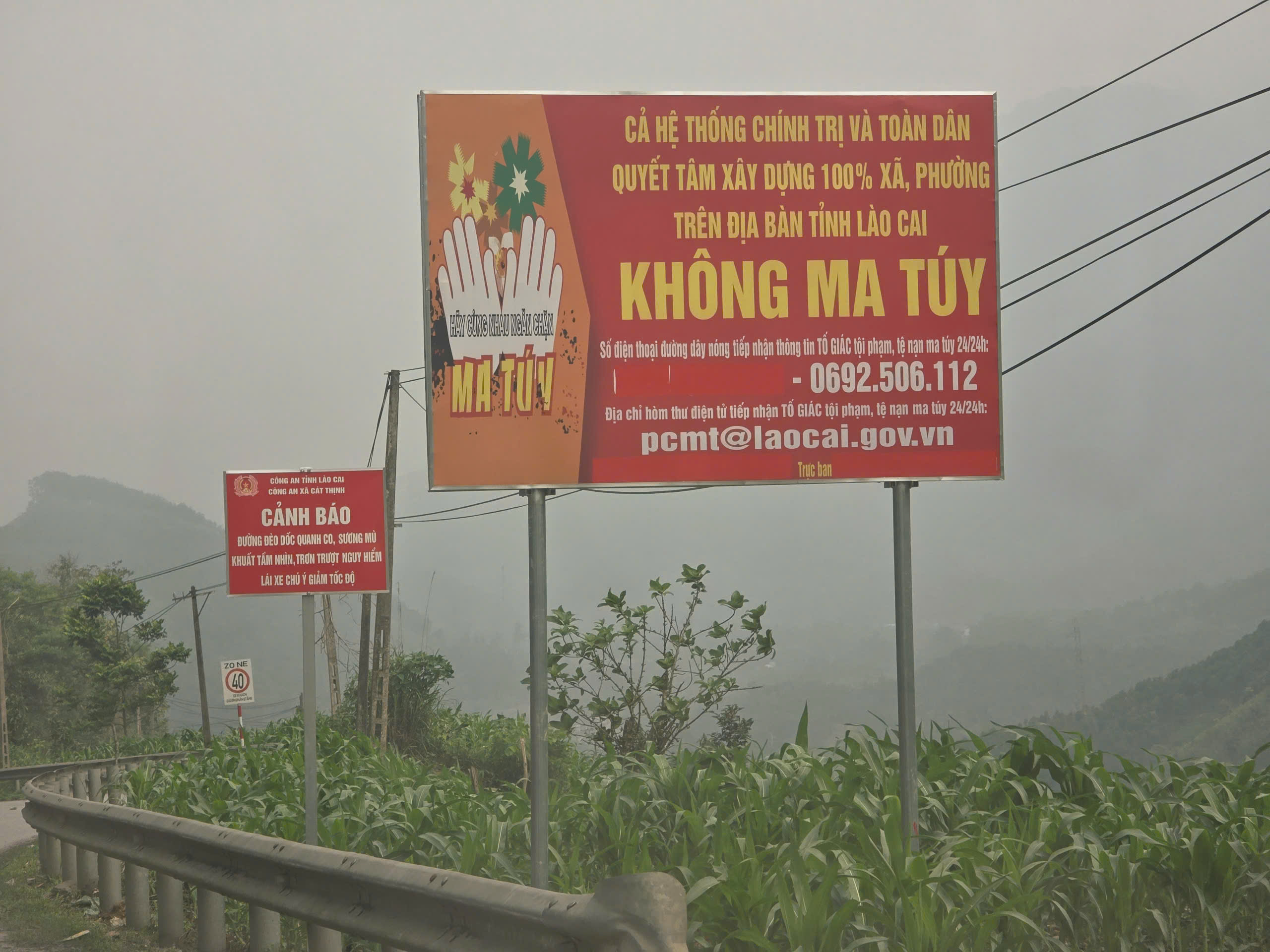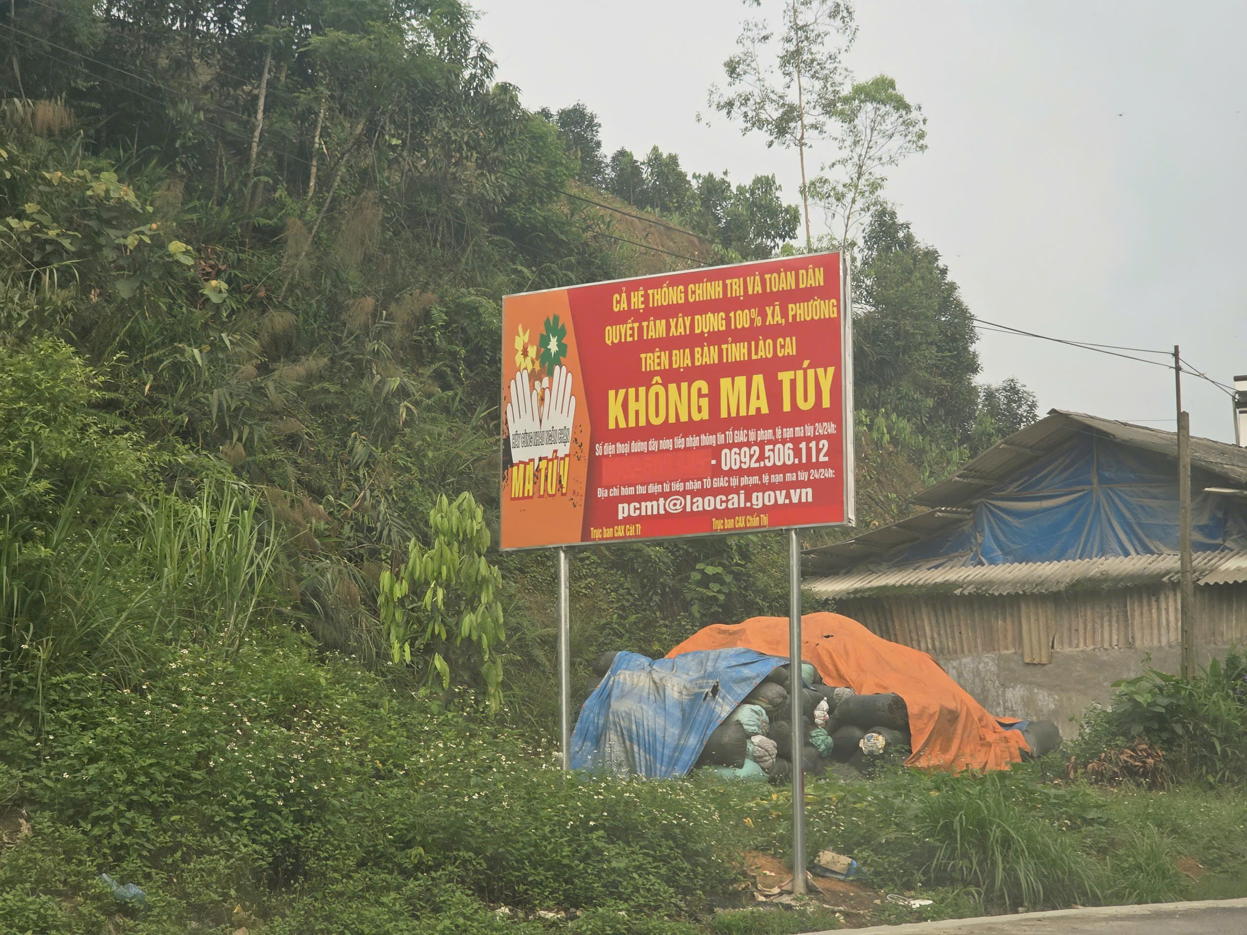 Nhiều tấm biển pano và đường dây nóng "không ma túy" được cắm ở khắp bản làng đến nhà máy, công ty.