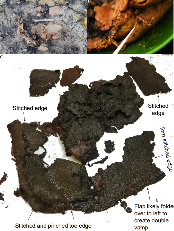 Nhóm chuyên gia tìm thấy một giỏ đựng bằng vỏ cây bạch dương khâu, cho thấy nó từng là một phần của chiếc giỏ được gia cố dùng để vận chuyển vật nặng, cùng gậy gỗ, gậy chạm khắc có vát cạnh, cán phi tiêu atlatl và một chiếc ủng da khâu. Ảnh: @Bảo Tàng British Columbia.