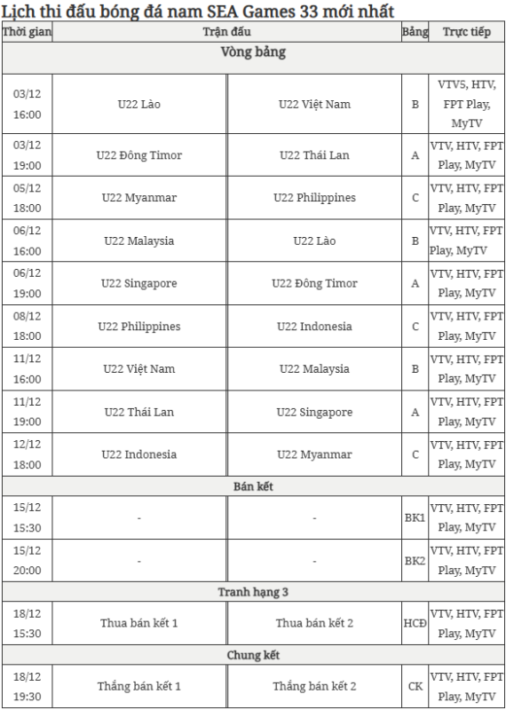 U22 Việt Nam gần như là đội tuyển đầu tiên ra sân thi đấu tại SEA Games năm nay khi có trận ra quân tại bảng B gặp U22 Lào vào lúc 16h00. Trong khi đó, U22 Thái Lan sẽ chạm trán U22 Đông Timor vào lúc 19h00. Cả 2 trận đấu đều được tổ chức tại SVĐ Rajamangala.
