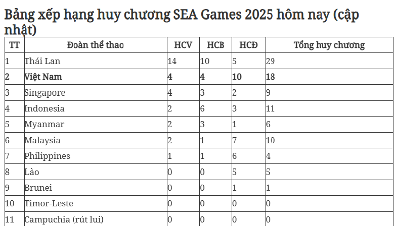 SEA Games 2025 đã khai mạc vào tối qua, 9-12 và sẽ bế mạc vào 20-12-2025. Theo thống kê từ ban tổ chức, sẽ có 9366 VĐV tranh tài ở 50 môn thể thao với tổng cộng 574 bộ huy chương. Trong khi chủ nhà Thái Lan dĩ nhiên đặt mục tiêu số một toàn đoàn thì đoàn thể thao Việt Nam cũng đặt mục tiêu giành 110 HCV để nằm trong Top 3 bảng xếp hạng huy chương, và phấn đấu ở vị trí thứ hai.
