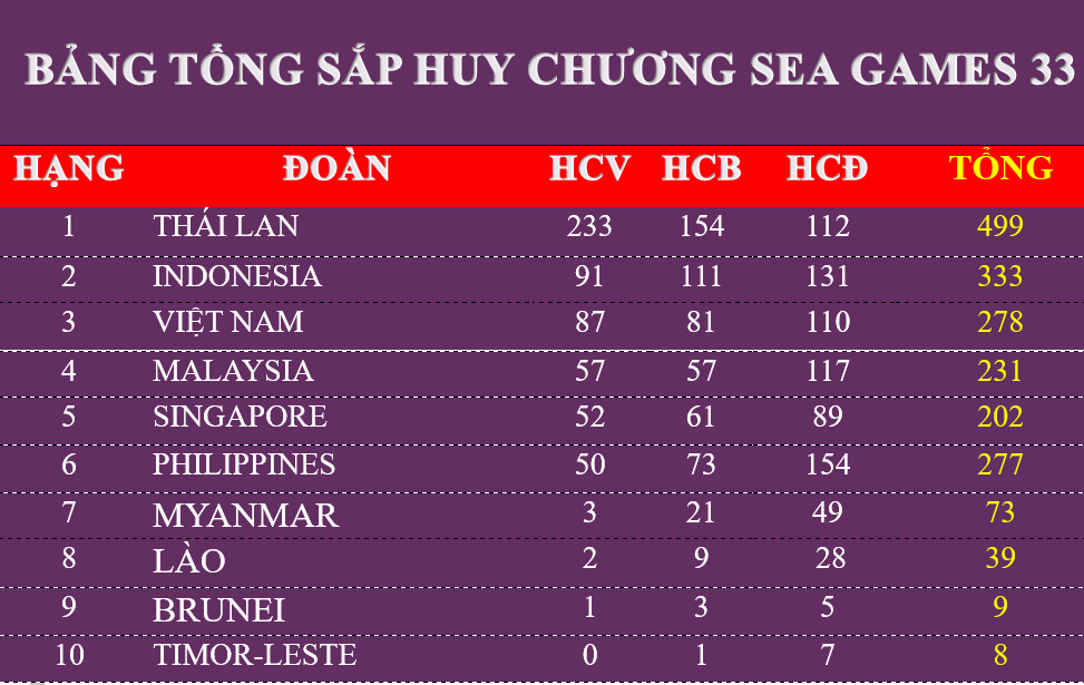 SEA Games 33 sẽ chính thức khép lại bằng lễ bế mạc diễn ra vào tối nay (20-12). Ngôi đầu bảng tổng sắp huy chương thuộc về chủ nhà Thái Lan với 233 HCV, 154 HCB, 112 HCĐ. Dù chỉ đứng thứ 6 về số lượng vận động viên tham dự (841 tuyển thủ), đoàn thể thao Việt Nam vẫn "cán đích" xuất sắc với vị trí thứ 3 toàn đoàn. Đáng chú ý, đây cũng là kỳ SEA Games cho thấy sự thành công của nhóm môn Asiad, Olympic khi giành 66 HCV (chiếm tỉ lệ gần 76% tổng số HCV của đoàn). Những thành tích nổi bật như: điền kinh giữ được sự thống trị 12 HCV, vật có 10 HCV, bắn súng có 8 HCV, bơi có 7 HCV, karate có 6 HCV, taekwondo có 4 HCV…