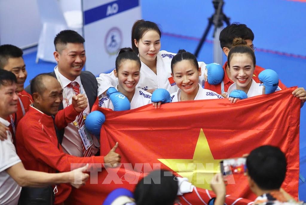 Các VĐV Hoàng Thị Mỹ Tâm, Đinh Thị Hương, Nguyễn Thị Diệu Ly và Nguyễn Thị Thu thi đấu xuất sắc, đánh bại chủ nhà Thái Lan 2-0, giành HCV. Ảnh: TTXVN phát