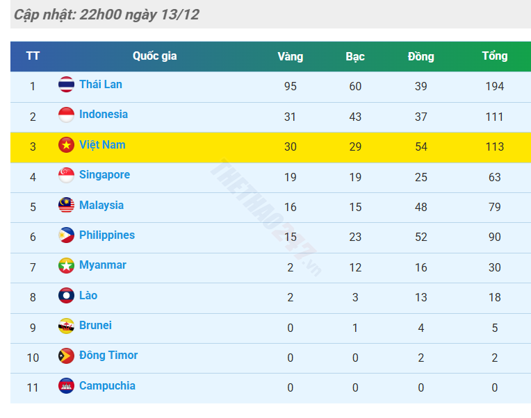 Bảng tổng sắp huy chương ngày 13/12.