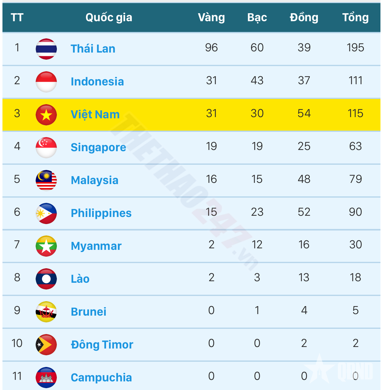 Tính đến 11 giờ 30 phút sáng 14-12, bảng tổng sắp huy chương SEA Games 33 ghi nhận những biến động đáng chú ý. Đoàn thể thao Indonesia vẫn xếp vị trí thứ hai, xếp trên Việt Nam nhờ nhiều hơn số lượng Huy chương Bạc (HCB). Đoàn Thái Lan tiếp tục giữ vững ngôi đầu bảng với tổng cộng 95 HCV.