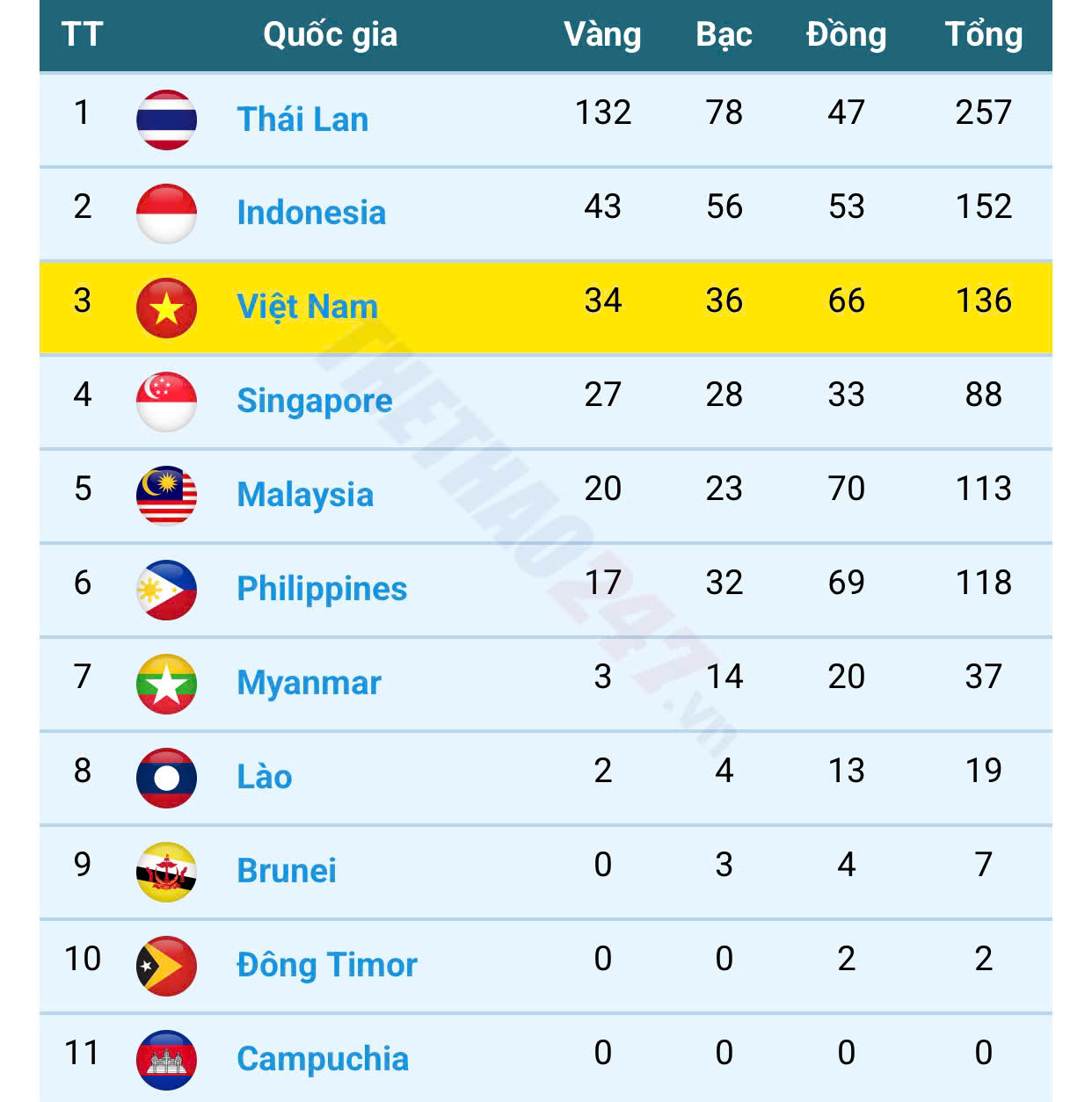 Bảng tổng sắp huy chương SEA Games 33 (trưa 15-12): Đoàn thể thao Việt Nam xếp thứ ba