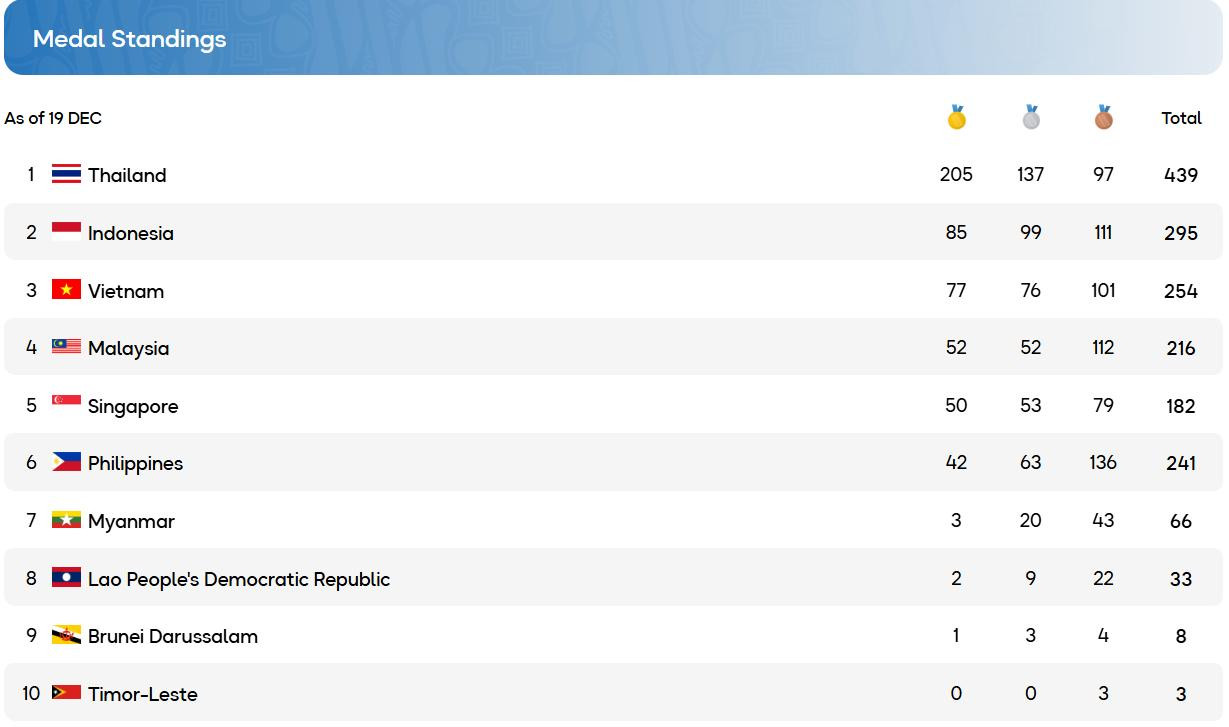 Bảng tổng sắp huy chương SEA Games 33 hôm nay 19/12 (liên tục cập nhật...)
