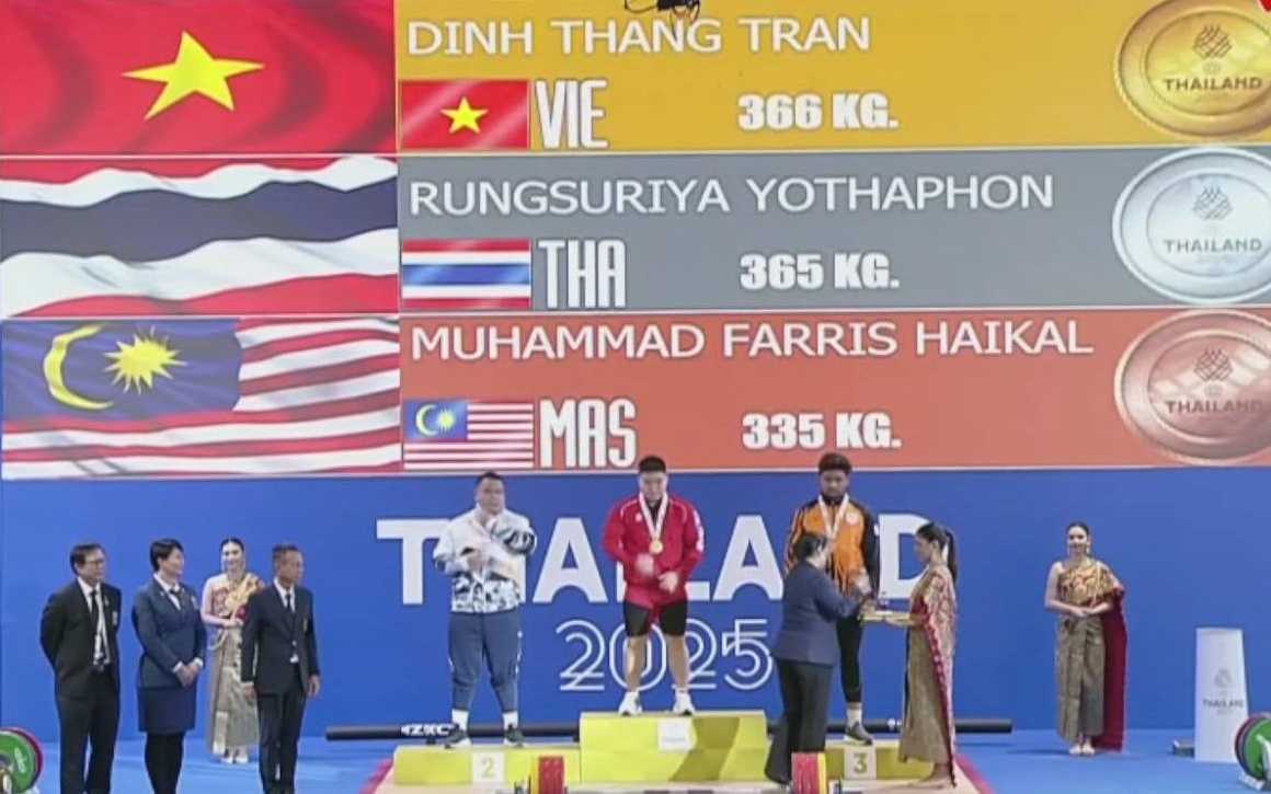 16h12: HCV thứ 60 từ môn Cử tạ. Trần Đình Thắng xuất sắc đánh bại đô cử Thái Lan để giành huy chương vàng hạng cân +94 kg với tổng thành tích 366 kg. Ở lần cử giật thứ 3, thành tích ban đầu được công nhận 162 kg, nhưng sau khi các trọng tài xem lại video, kết quả được điều chỉnh, khẳng định chiến thắng thuyết phục của Đình Thắng.