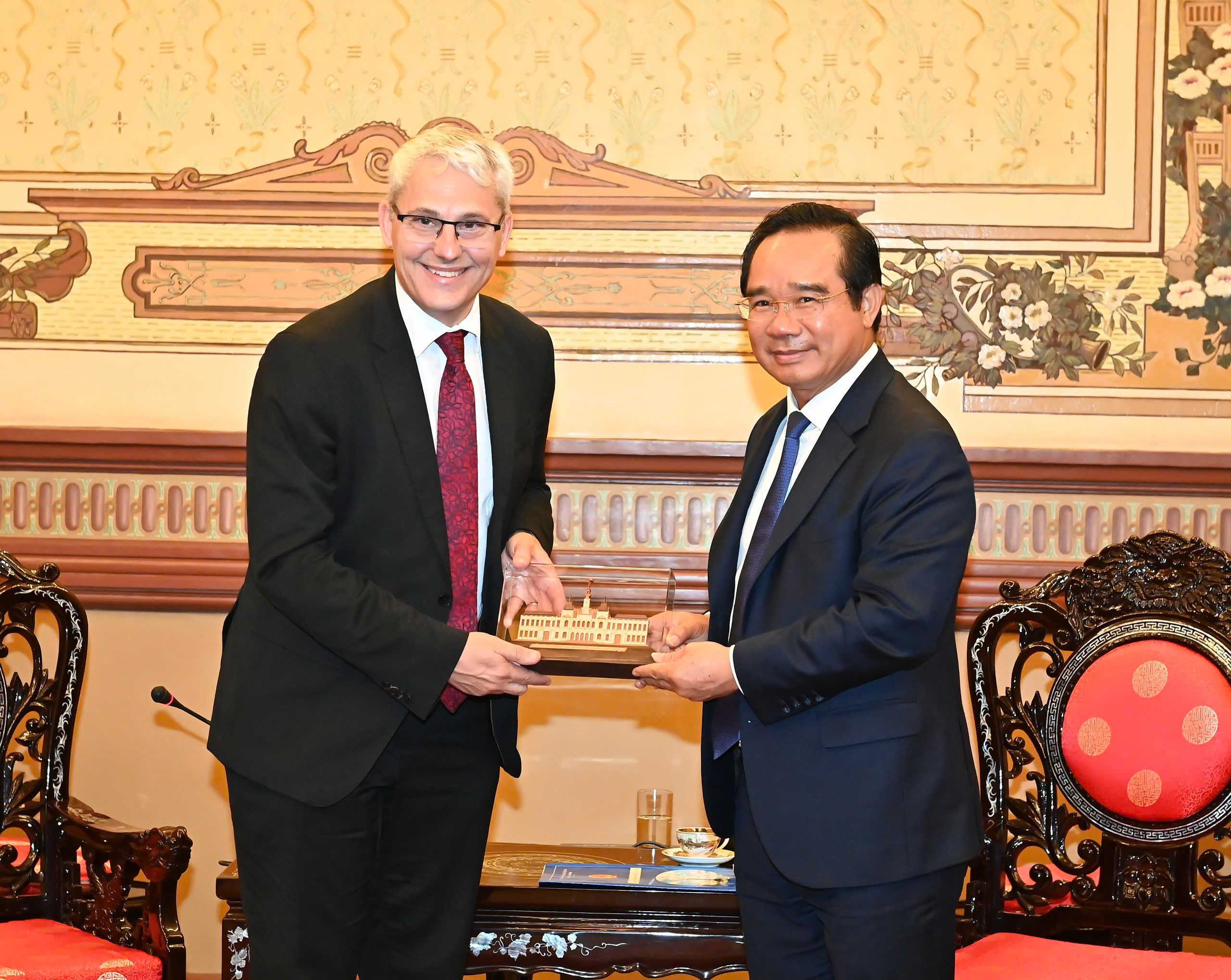 Lãnh đạo TPHCM tặng quà lưu niệm đến Bộ trưởng Kinh tế và Việc làm kiêm Bộ trưởng Tài chính bang Victoria của Australia. Ảnh: VIỆT DŨNG