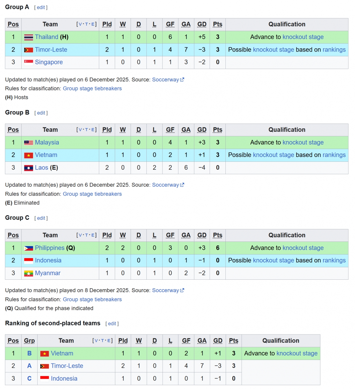 Bảng xếp hạng bóng đá nam SEA Games 33 mới nhất tính đến sáng 11/12.