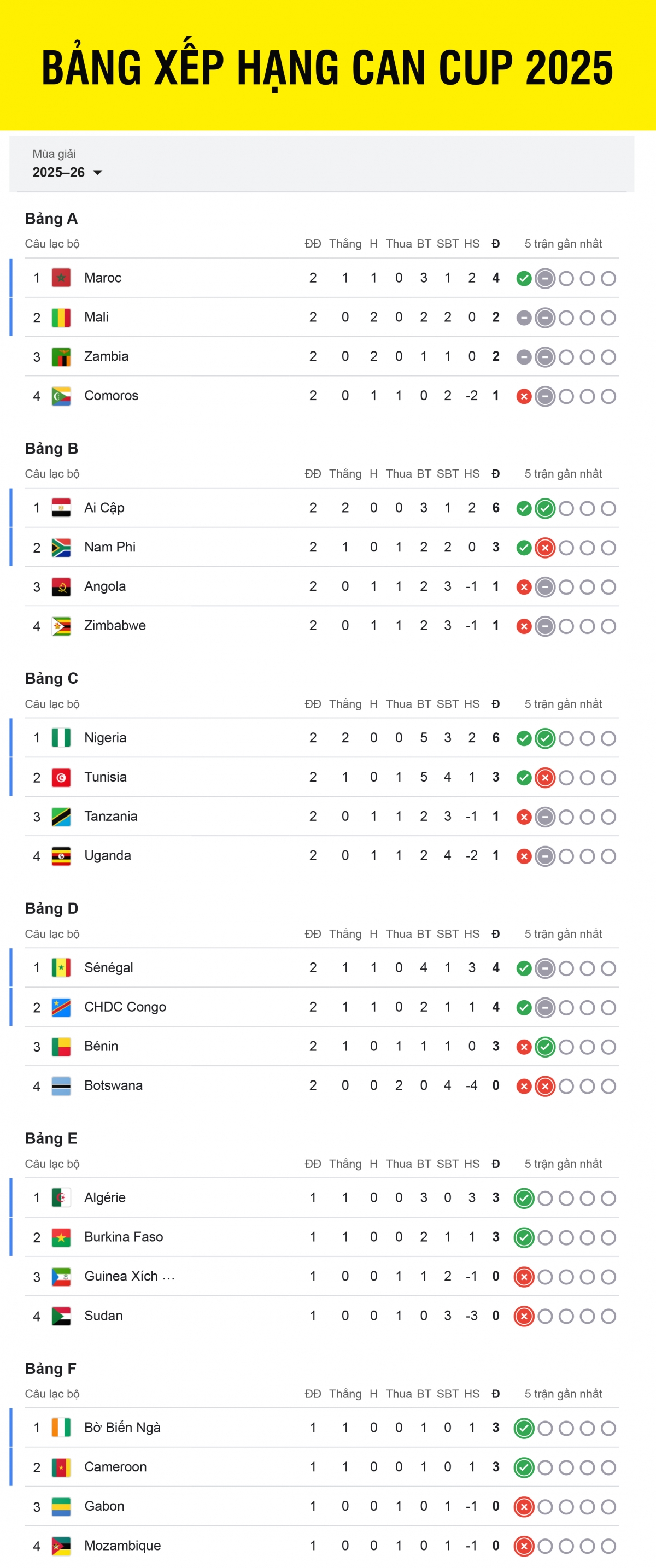 Bảng xếp hạng CAN Cup 2025 mới nhất