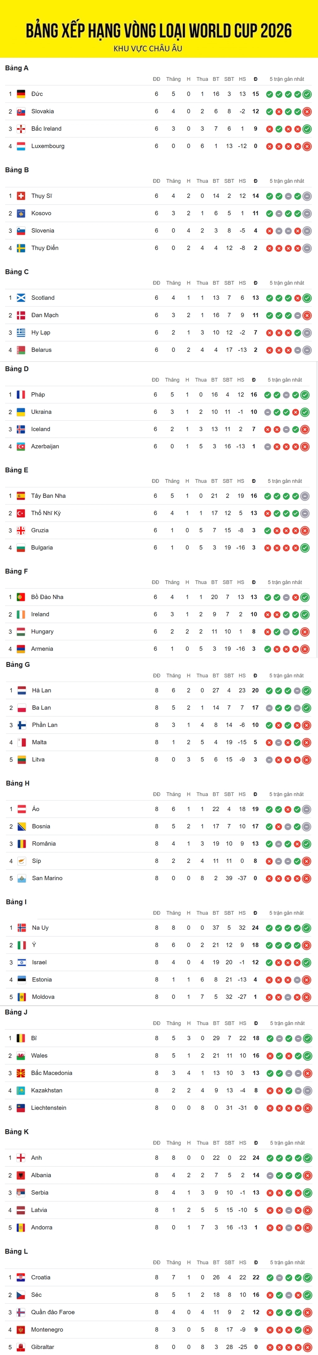 Bảng xếp hạng chung cuộc vòng loại World Cup 2026 khu vực châu Âu, xác định năm đội cuối cùng đoạt vé dự VCK. Các đội tuyển cuối cùng của châu Âu đoạt vé đến Bắc Mỹ mùa Hè 2026 gồm có: Tây Ban Nha, Scotland, Áo, Thụy Sĩ và Bỉ. Trong đó, Scotland là đội nhì bảng duy nhất trước lượt trận cuối có thể lật ngược tình thế và có vé đến với World Cup.