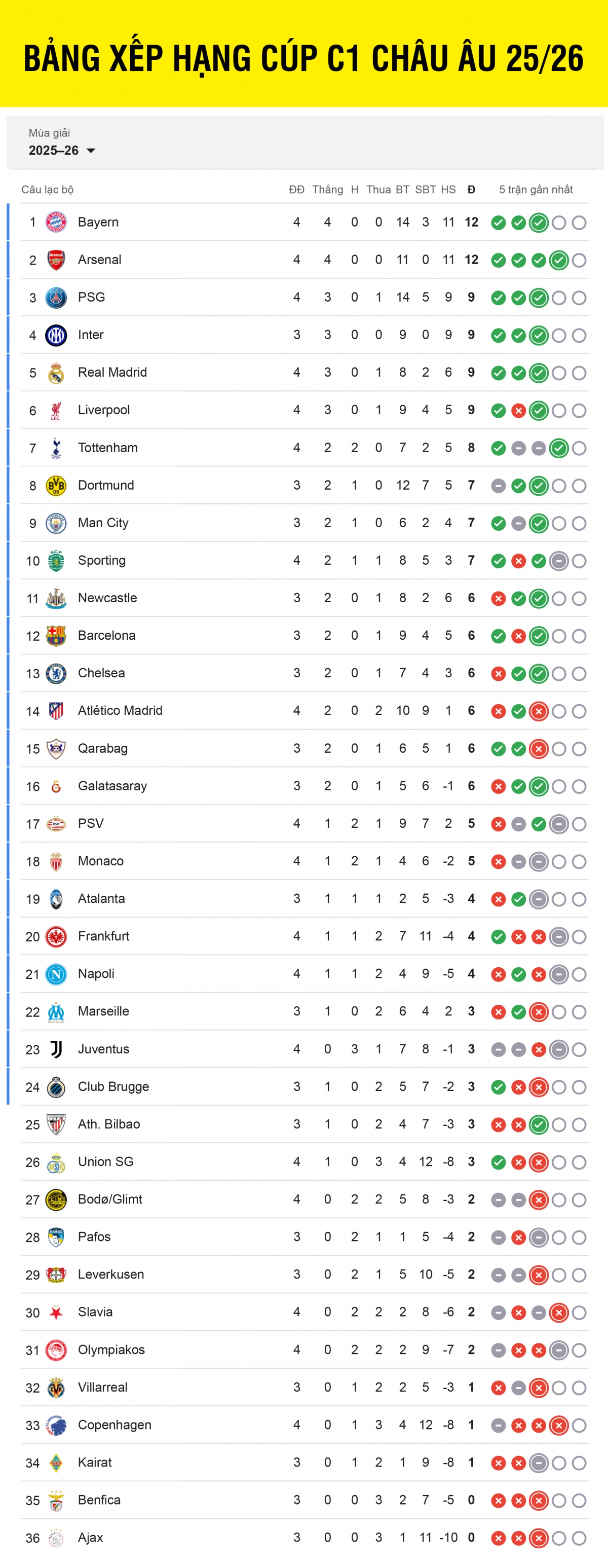 Bảng xếp hạng Cúp C1 châu Âu 2025/2026 tính đến sáng 5/11.