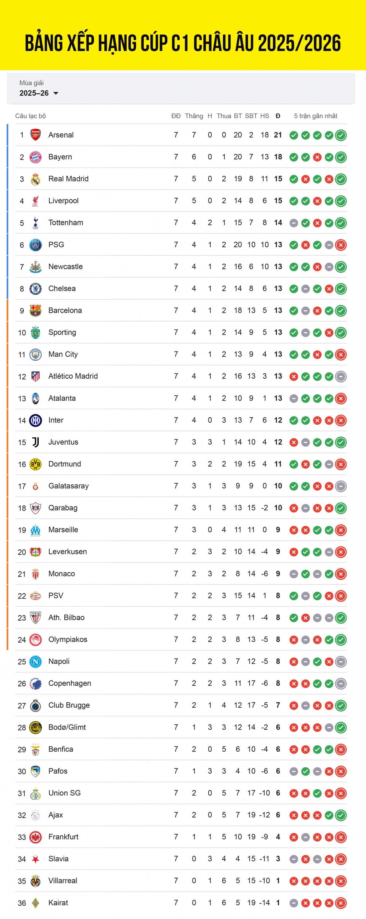 Cập nhật bảng xếp hạng Cúp C1 châu Âu 2025/2026 mới nhất, Arsenal dẫn đầu tuyệt đối với 7 chiến thắng liên tiếp, Bayern đứng thứ 2 với 15 điểm. Đây là hai đội bóng đã giành vé sớm vào vòng 1/8. Real Madrid và Liverpool sau chiến thắng ở loạt trận thứ 7 bám sát ngay phía sau Arsenal và Bayern.