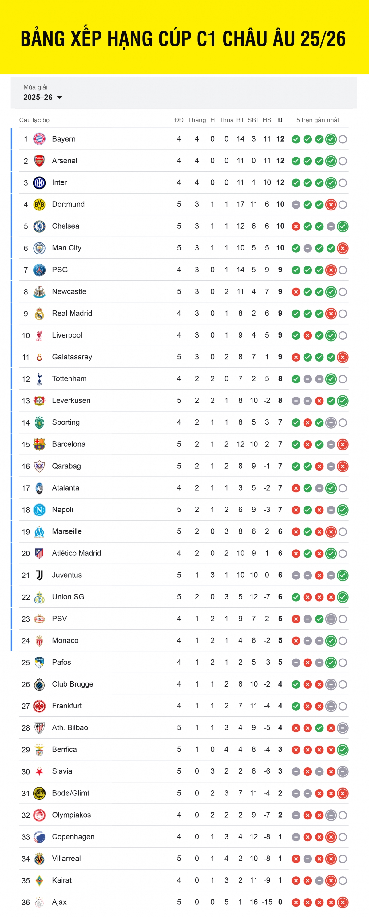 Bảng xếp hạng Cúp C1 châu Âu 2025/2026 mới nhất tính đến sáng 26/11.