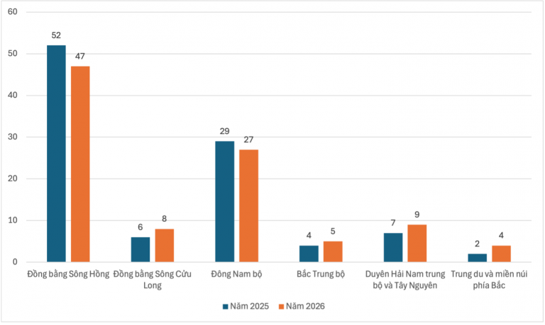 Xét riêng theo vùng kinh tế, các trường có thứ hạng cao vẫn tập trung chủ yếu ở Đồng bằng sông Hồng và Đông Nam Bộ, mặc dù số lượng cơ sở giáo dục đại học của hai vùng này trong Top 100 giảm nhẹ so với năm 2025.